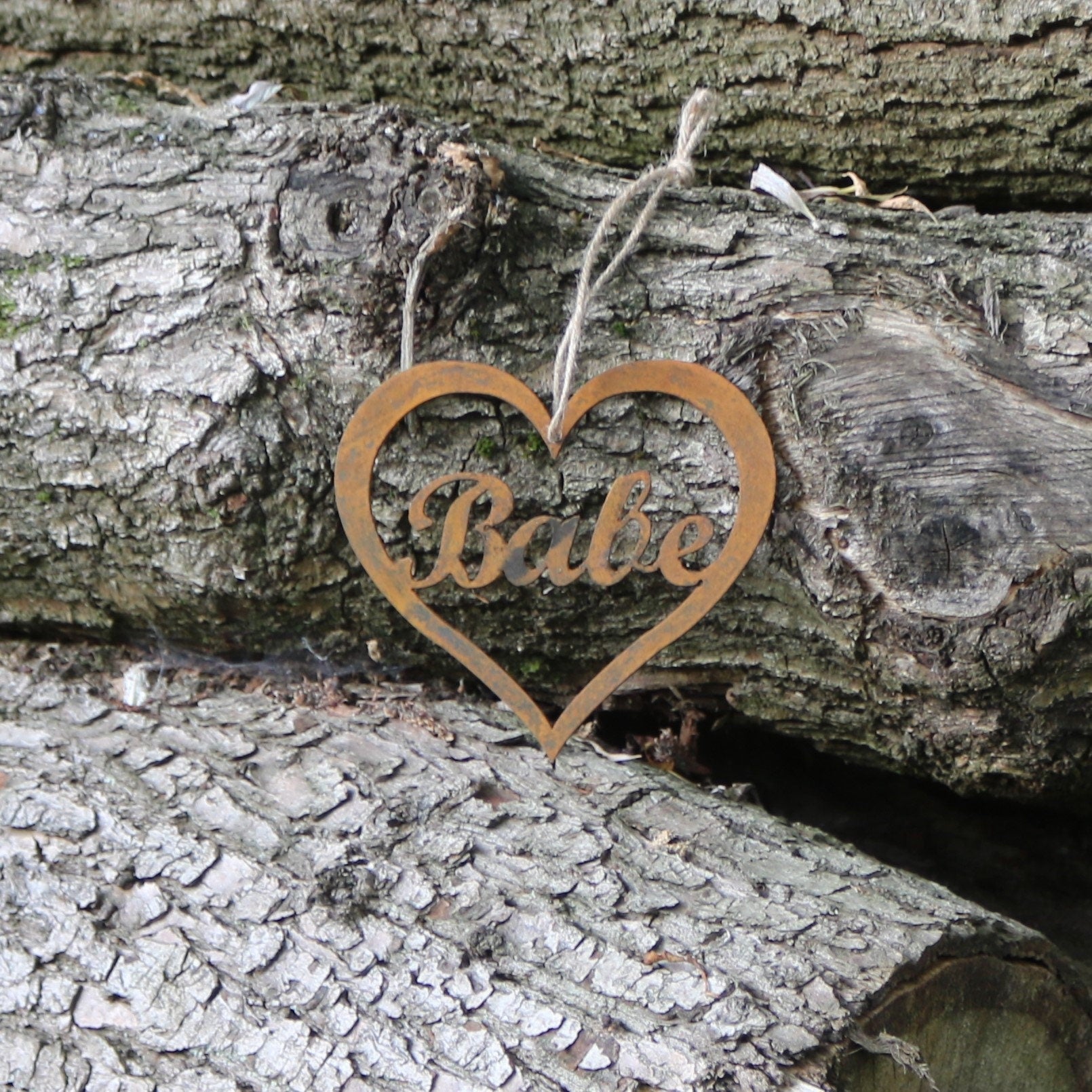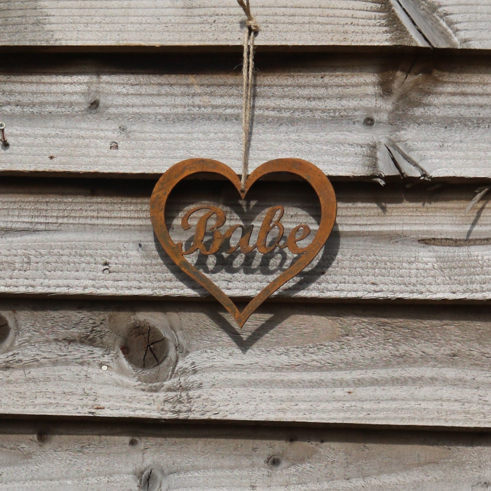 A rusty metal hanging Babe heart keepsake decoration. The heart, made from mild steel, will weather naturally outside in the element or is a rustic decoration for the home. This item is hand finished and may vary slightly from the photograph.