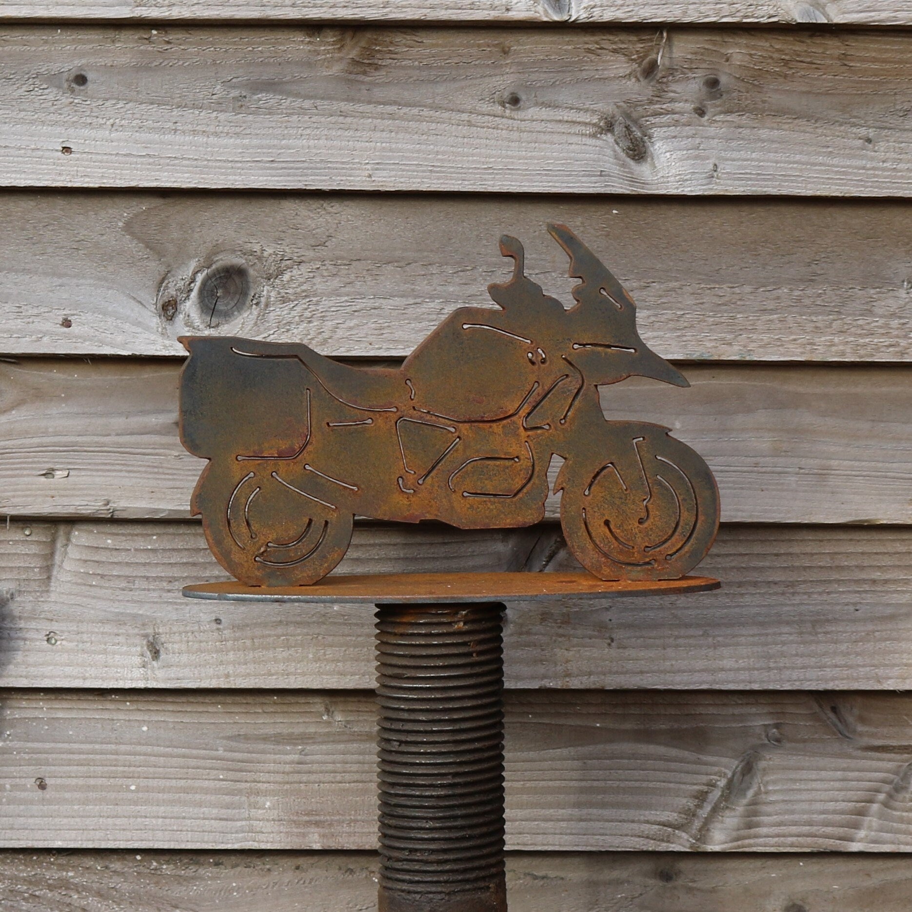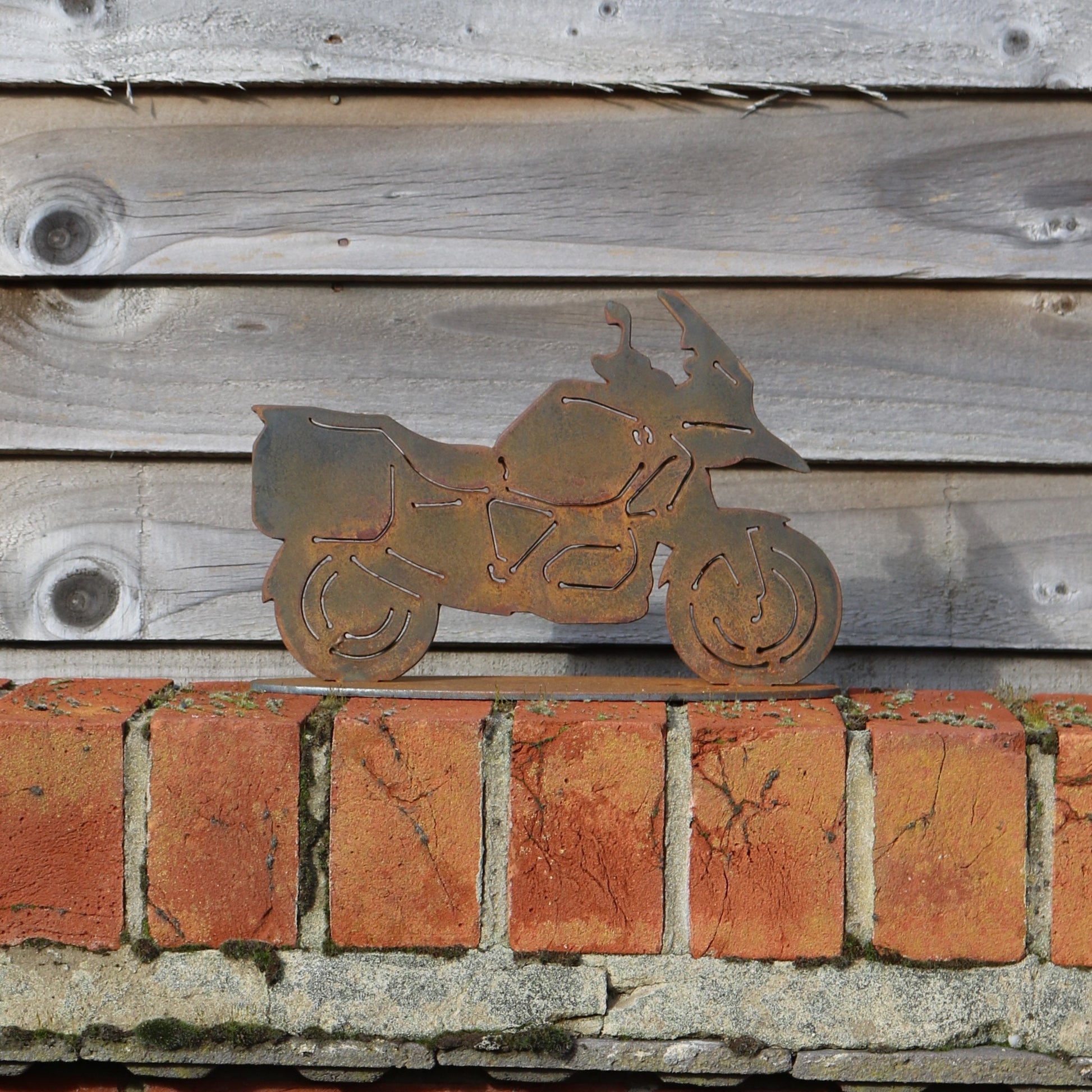 BMW motorbike statue, home decoration made from rusty metal. The mild steel is designed to weather naturally out in the elements, the beautiful rusty colours and textures will bring a truly organic feel to your planters, flower beds and borders. It is also a fabulous rustic ornament for the home. This item is hand finished, so may differ slightly from the photograph.