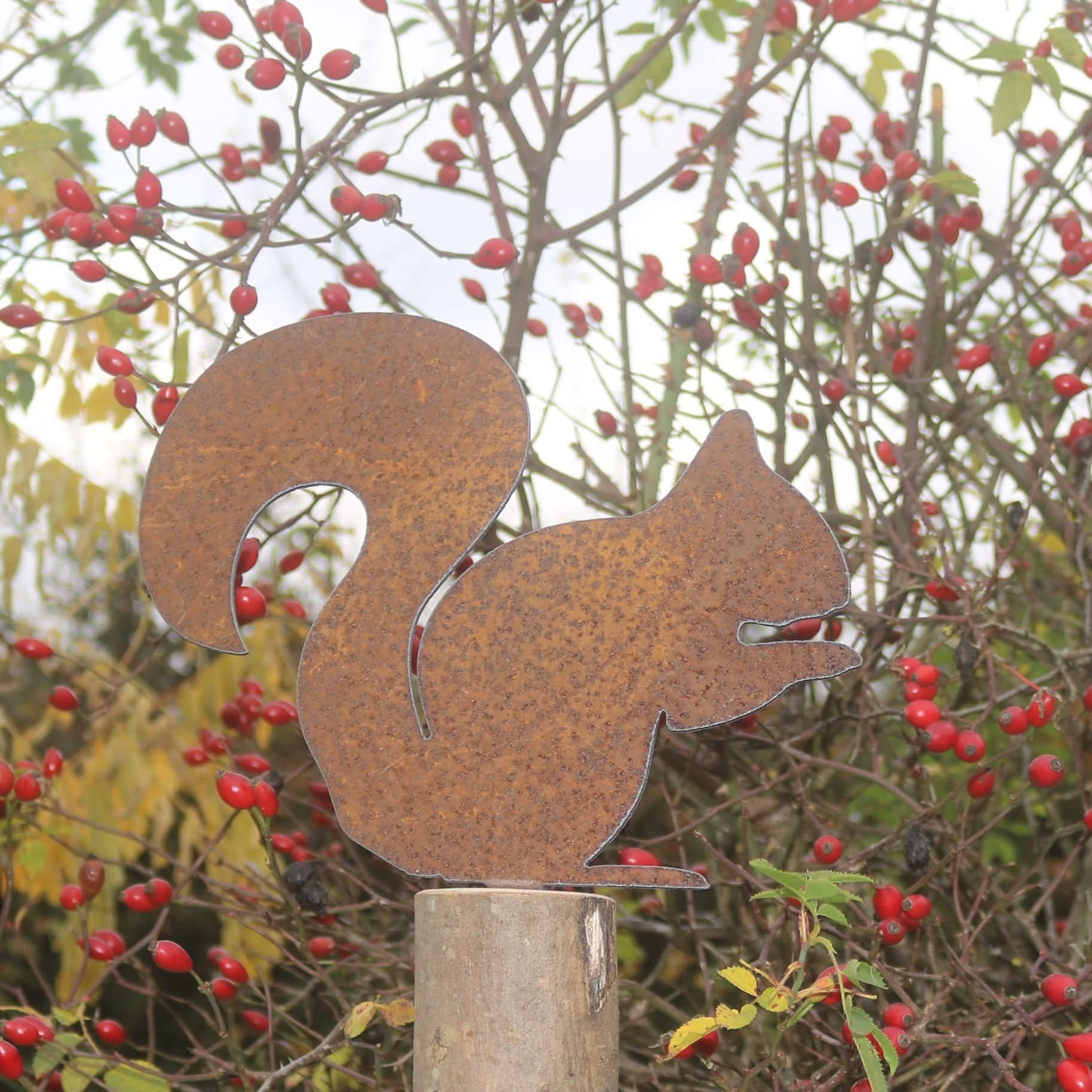 Add a new dimension and all year round interest to your garden with our attractive rusty metal squirrel post/fence topper garden decoration. The mild steel is designed to weather naturally out in the elements, the beautiful rusty colours and textures will bring a truly organic feel to your garden. It is also a fabulous rustic ornament for the home. This item is hand finished, so may differ slightly from the photograph.