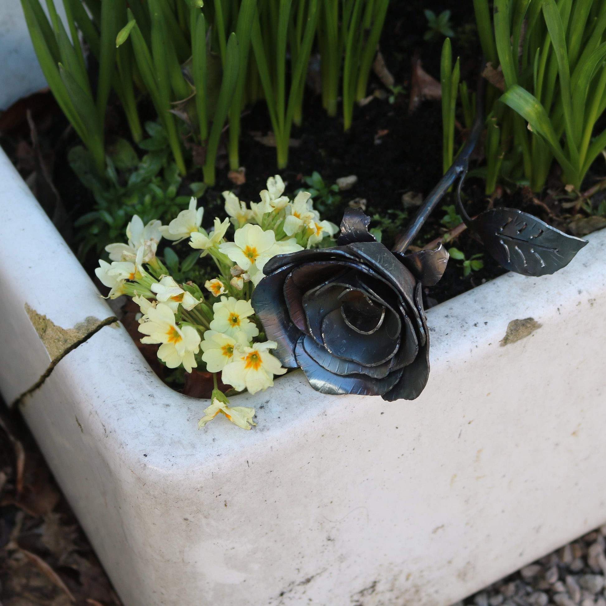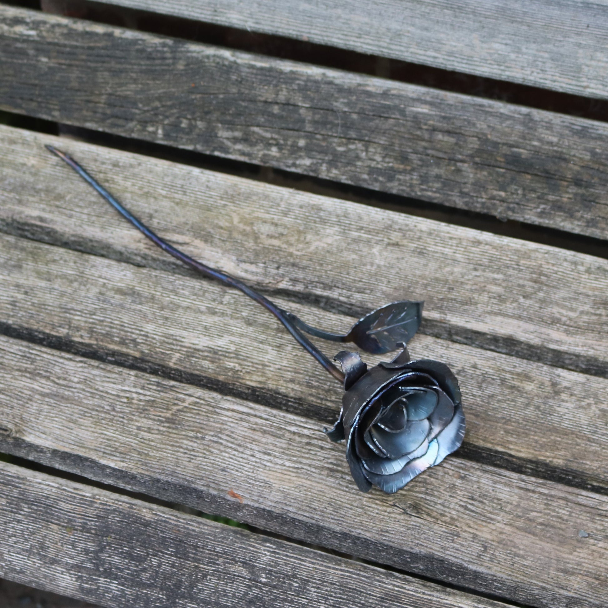 Handmade raw steel rose. This special gift, perfect for a steel 11th anniversary, is completely unique. This rose, hand crafted from mild steel, will weather naturally outside. Alternatively, it is a delightful decoration for inside your home. The appearance of each rose will vary as they are hand made.