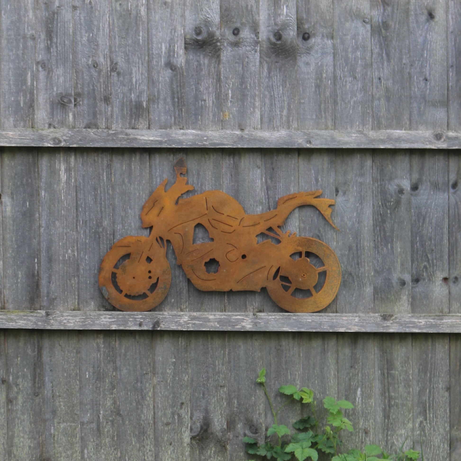 Kawasaki Z1000 motorcycle wall art, designed and made by us in the UK. Perfect gift for steel 11th anniversary, Fathers Day or gift for motorcycling enthusiast. The mild steel is designed to weather naturally out in the elements, the beautiful rusty colours and textures will bring a truly organic feel to your garden. It is also a fabulous rustic ornament for the home. This item is hand finished, so may differ slightly from the photograph.