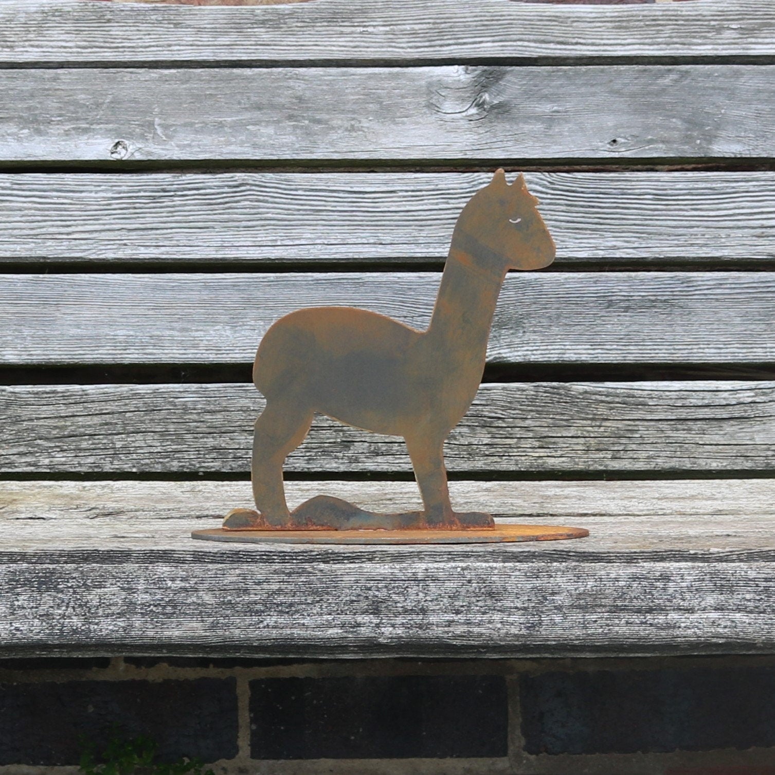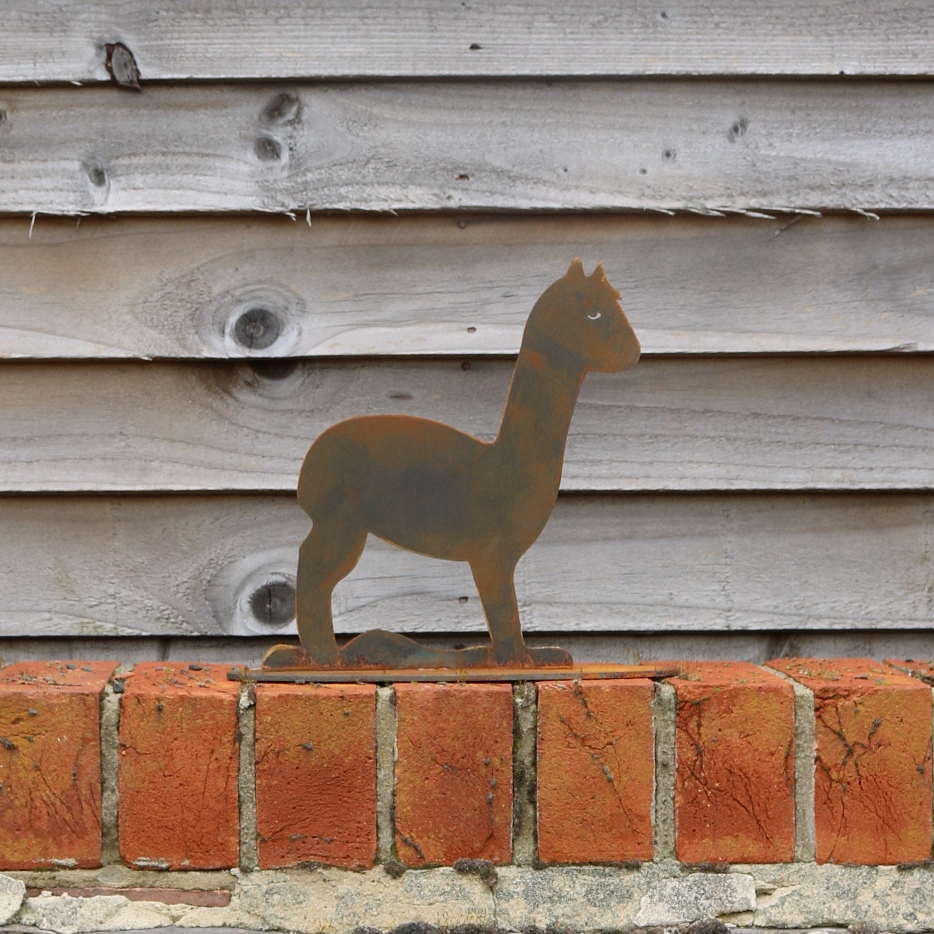 Rusty metal llama home and garden ornament. The mild steel is designed to weather naturally out in the elements, the beautiful rusty colours and textures will bring a truly organic feel to your planters, flower beds and borders. It is also a fabulous rustic ornament for the home. This item is hand finished, so may differ slightly from the photograph.