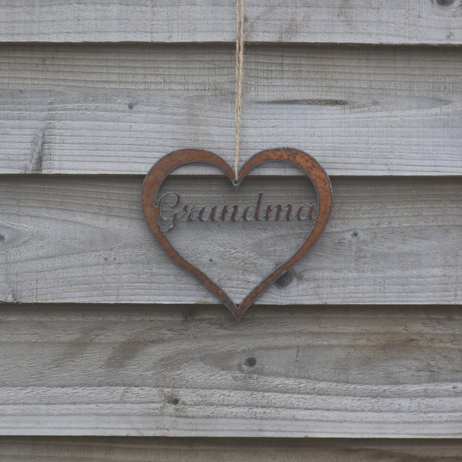 Rusty metal hanging grandma heart decoration. Add all year round interest to your garden with our attractive rusty grandma heart garden decoration. The mild steel is designed to weather naturally out in the elements, the beautiful rusty colours and textures will bring a truly organic feel to your garden. Also a perfect rustic decoration for the home. This item is hand finished so may vary slightly from the photograph.