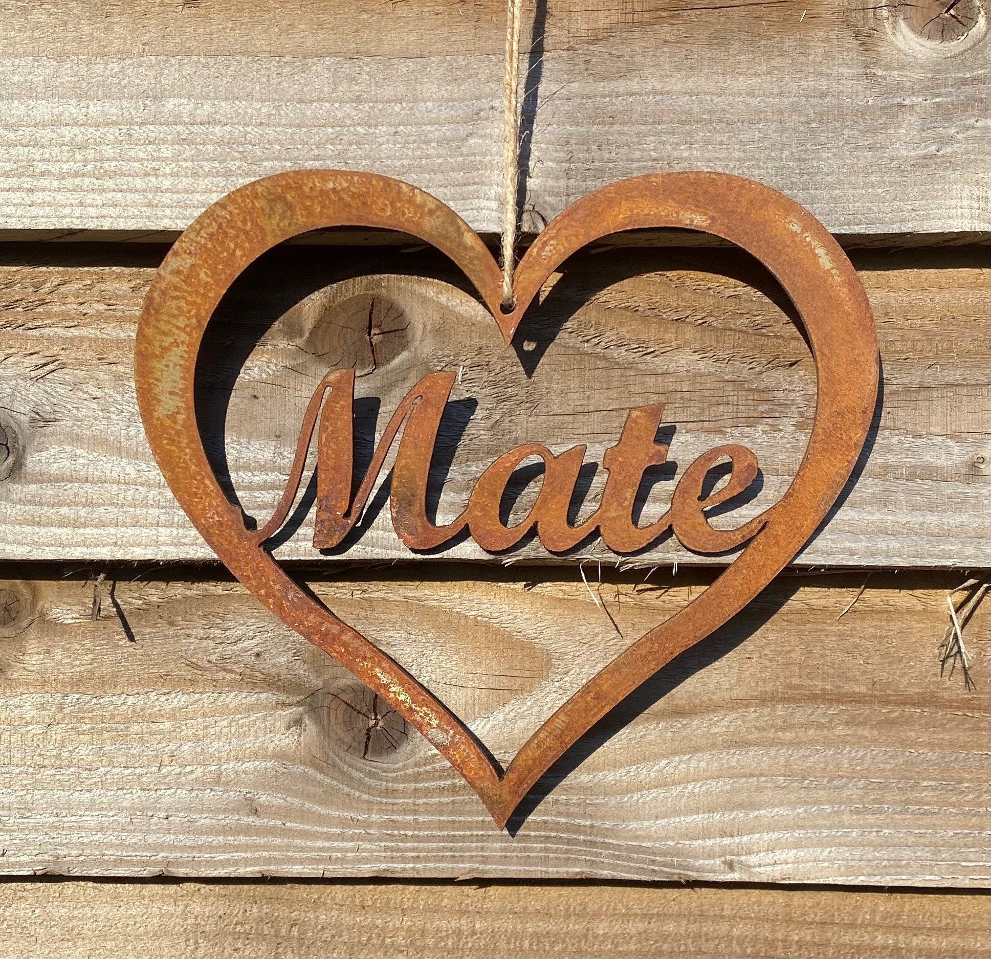 Rusty metal hanging Mate heart decoration. Add all year round interest to your garden with our attractive rusty gran heart garden decoration. The mild steel is designed to weather naturally out in the elements, the beautiful rusty colours and textures will bring a truly organic feel to your garden. Also a perfect rustic decoration for the home. This item is hand finished so may vary slightly from the photograph.