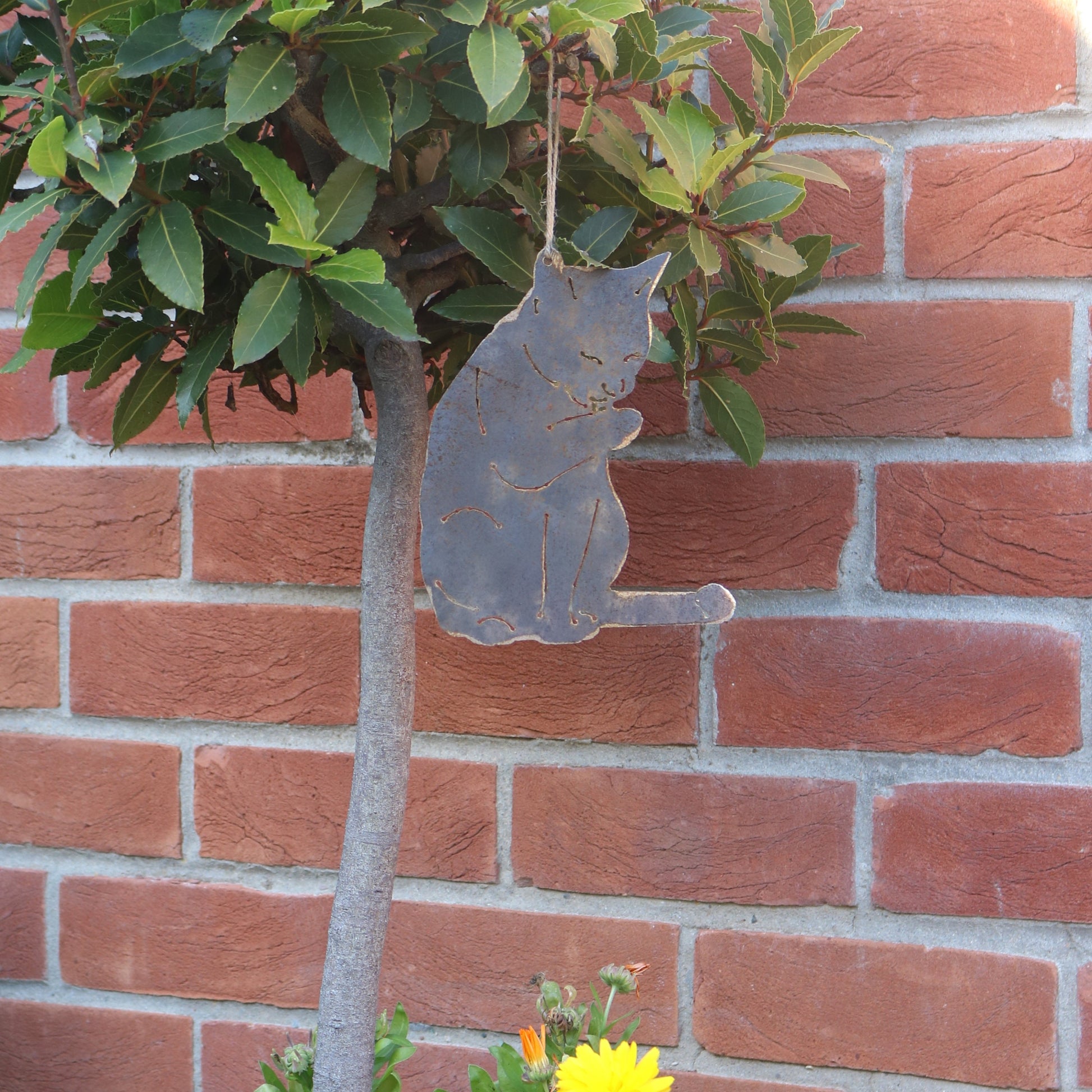 Bespoke design rusty metal hanging cat licking paw, home and garden decoration made from rusty metal. The mild steel is designed to weather naturally out in the elements, the beautiful rusty colours and textures will bring a truly organic feel to your planters, flower beds and borders. This item is hand finished, so may differ slightly from the photograph.