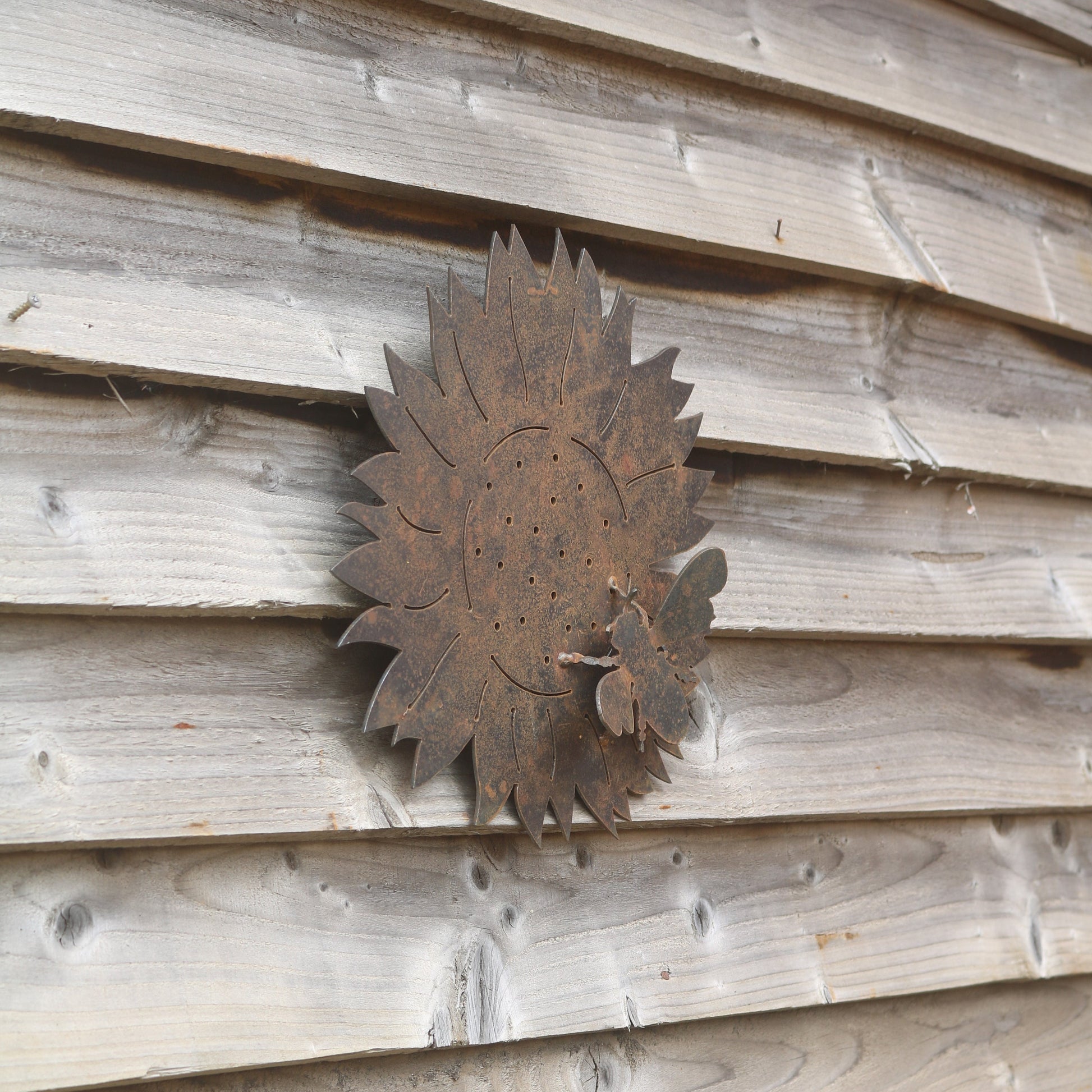 Our original design wall mounted 3D bee on sunflower wall art. Sunflower is flat in appearance with the bee welded on. Fitted with a tab on the back for hanging proud from the wall. The mild steel is designed to weather naturally out in the elements, the beautiful rusty colours and textures will bring a truly organic feel to your planters, flower beds and borders. This item is hand finished, so may differ slightly from the photograph.