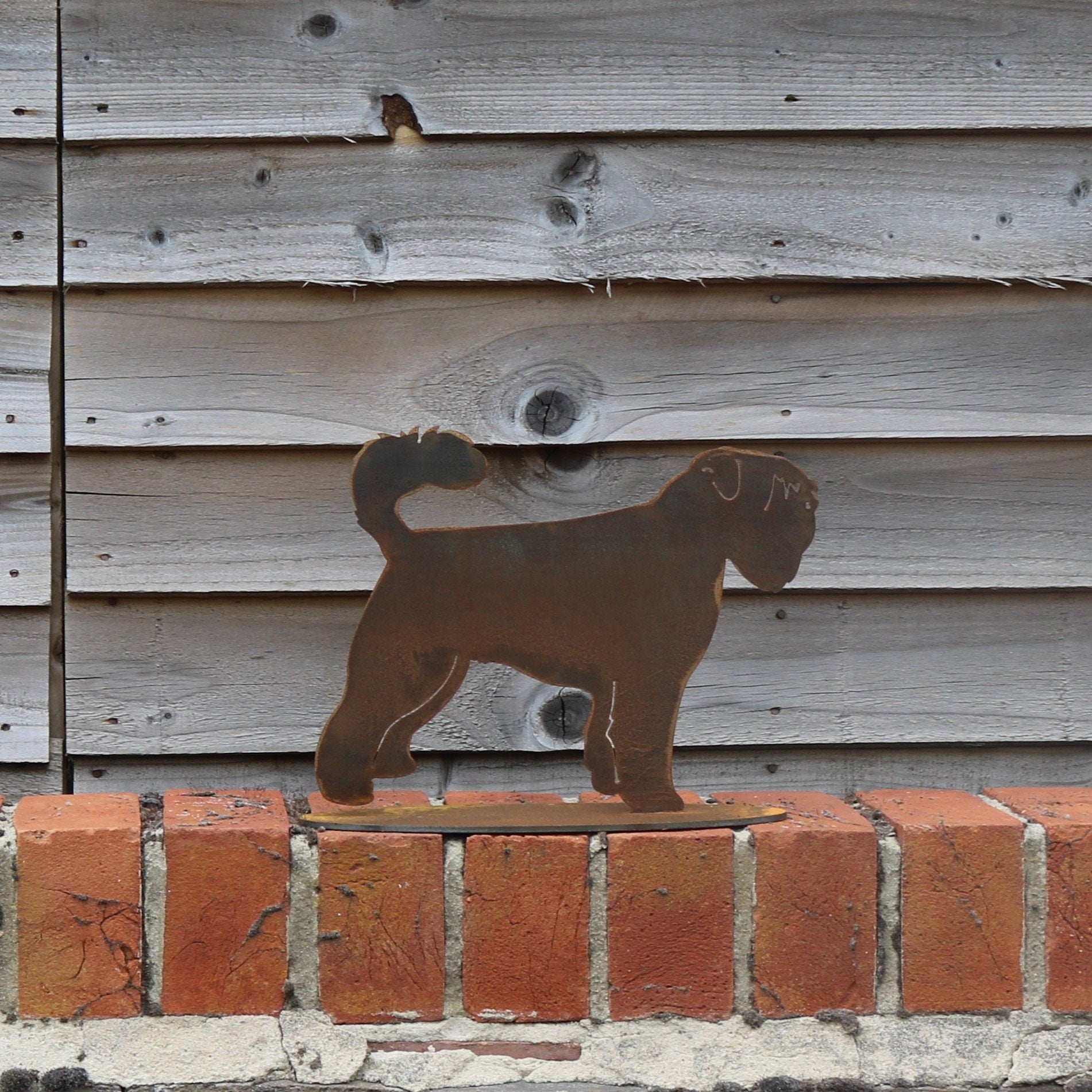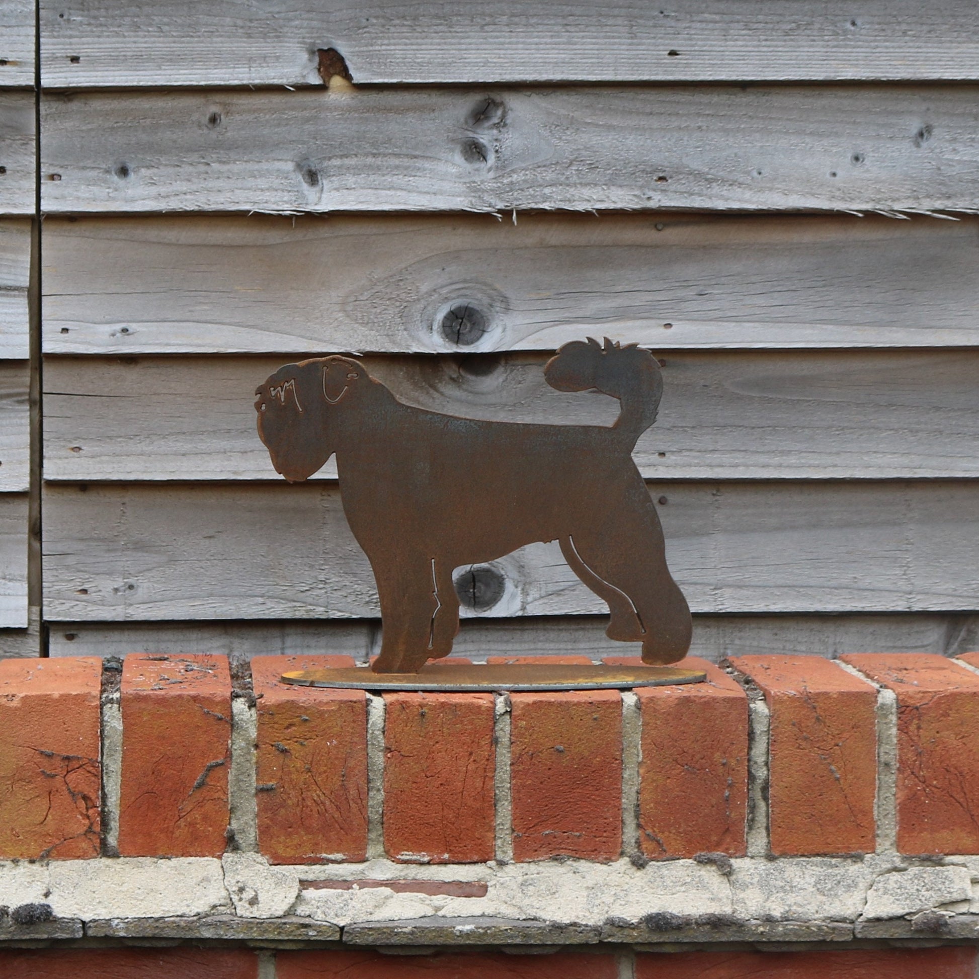 Bespoke Bouvier des Flandres dog rusty metal statue. The mild steel is designed to weather naturally out in the elements, the beautiful rusty colours and textures will bring a truly organic feel to your garden, planters, flower beds and borders. It is also a fabulous rustic ornament for the home. This item is hand finished, so may differ slightly from the photograph.