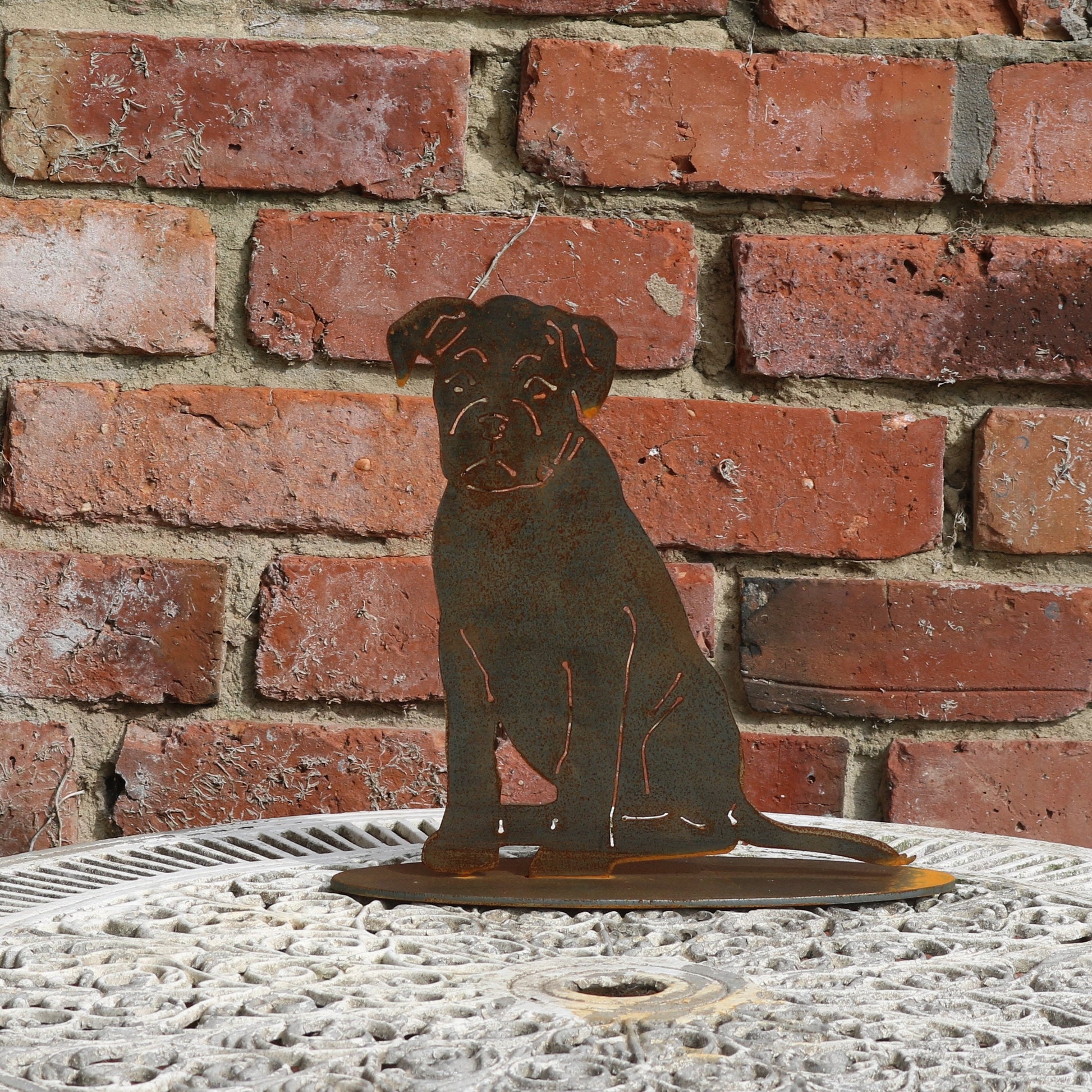 Rusty metal boxer dog statue. This is an original design of Molly. The mild steel is designed to weather naturally out in the elements, the beautiful rusty colours and textures will bring a truly organic feel to your garden, planters, flower beds and borders. This item is hand finished, so may differ slightly from the photograph.