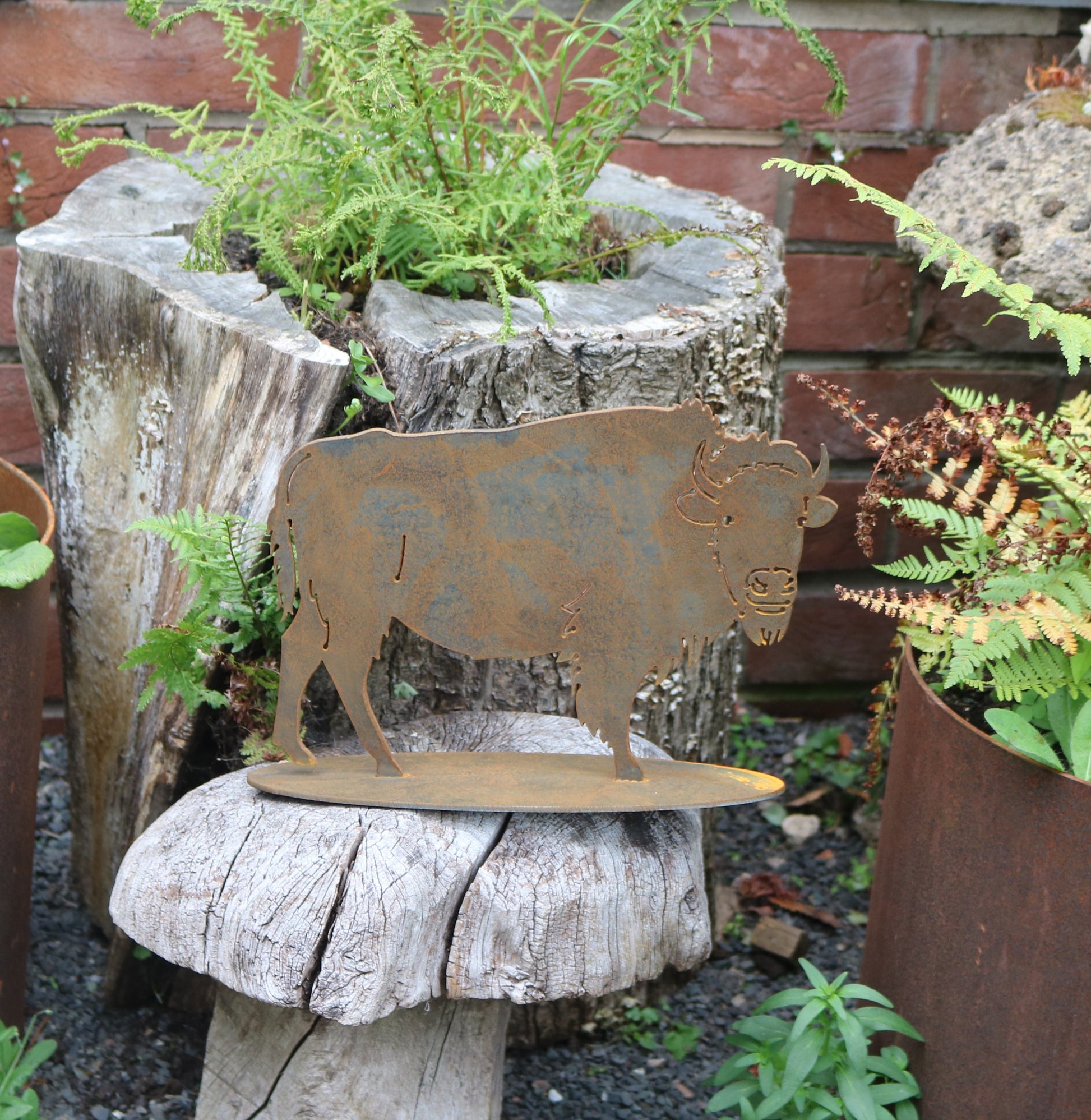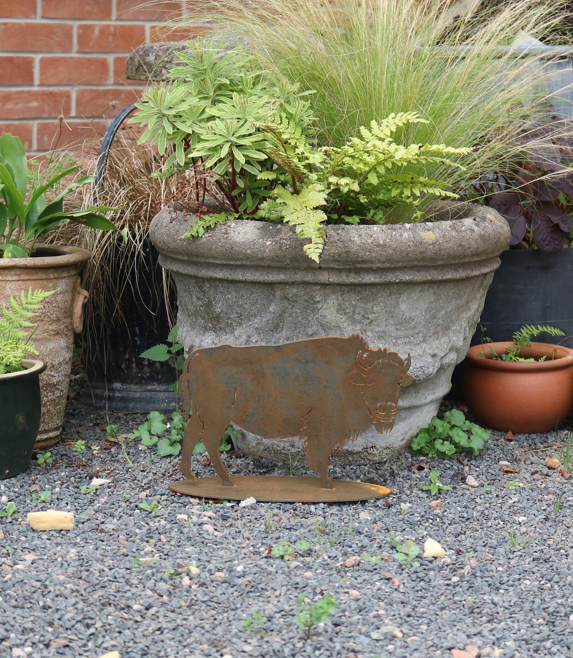Bespoke buffalo statue made from rusty metal. The mild steel is designed to weather naturally out in the elements, the beautiful rusty colours and textures will bring a truly organic feel to your planters, flower beds and borders. It is also a fabulous rustic ornament for the home.