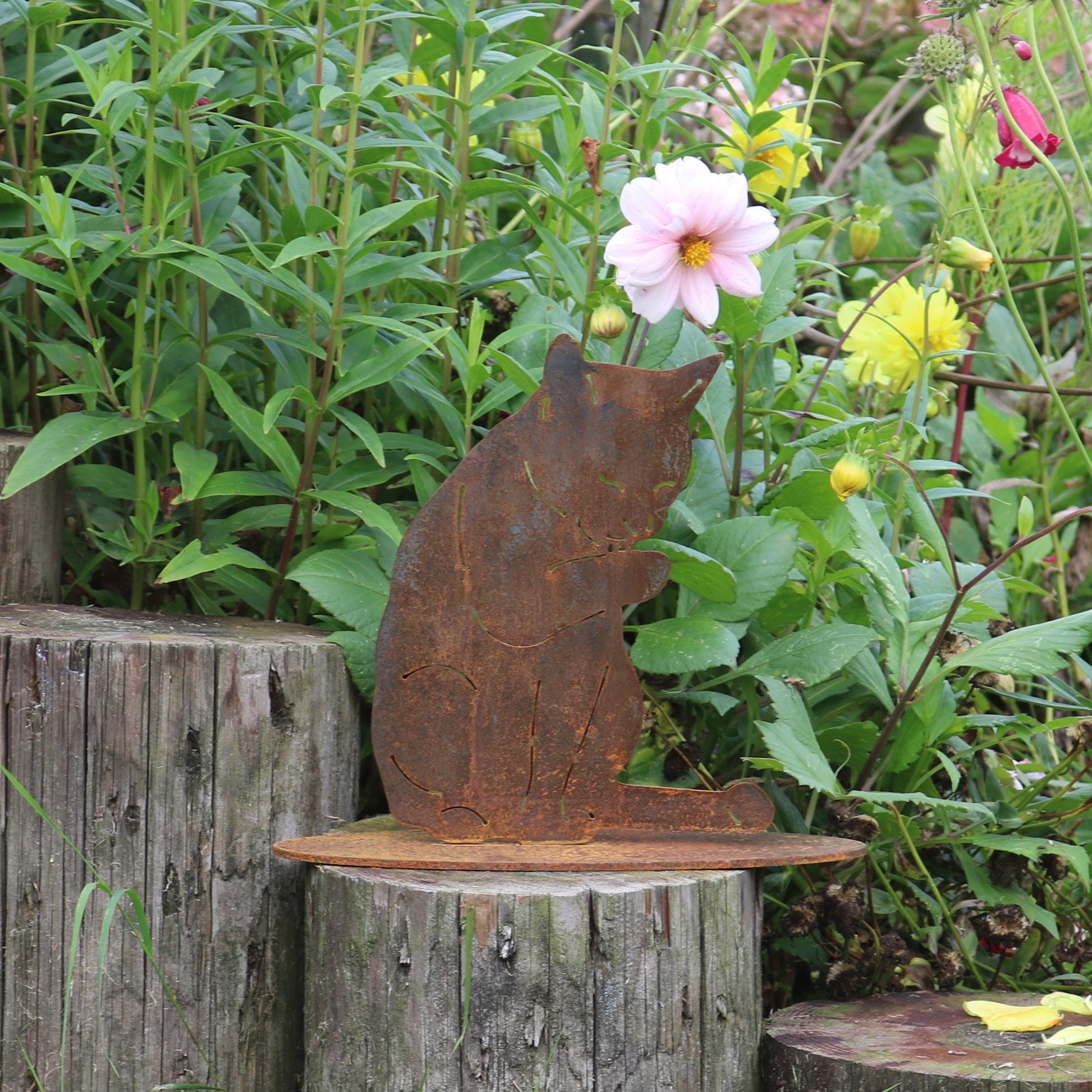 Rusty metal cat licking its paw statue. The mild steel is designed to weather naturally out in the elements, the beautiful rusty colours and textures will bring a truly organic feel to your garden, planters, flower beds and borders. This item is hand finished, so may differ slightly from the photograph.