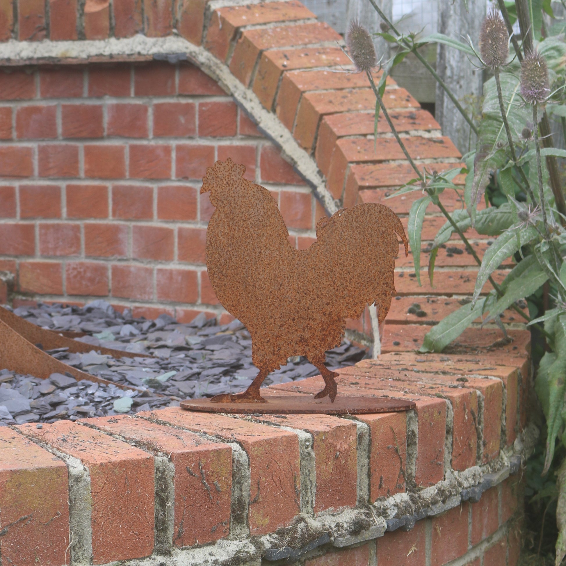 Rusty metal cockerel home and garden decoration. The mild steel is designed to weather naturally out in the elements, the beautiful rusty colours and textures will bring a truly organic feel to your planters, flower beds and borders. This item is hand finished, so may differ slightly from the photograph.