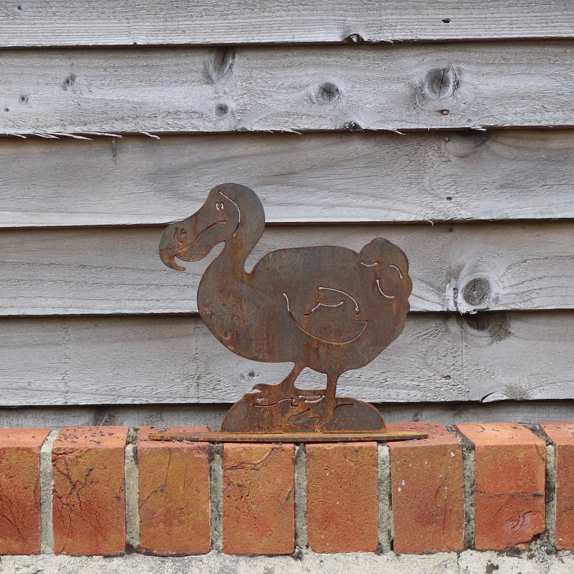 Bespoke rusty metal dodo home and garden ornament. The mild steel is designed to weather naturally out in the elements, the beautiful rusty colours and textures will bring a truly organic feel to your planters, flower beds and borders. It is also a fabulous rustic ornament for the home. This item is hand finished, so may differ slightly from the photograph.