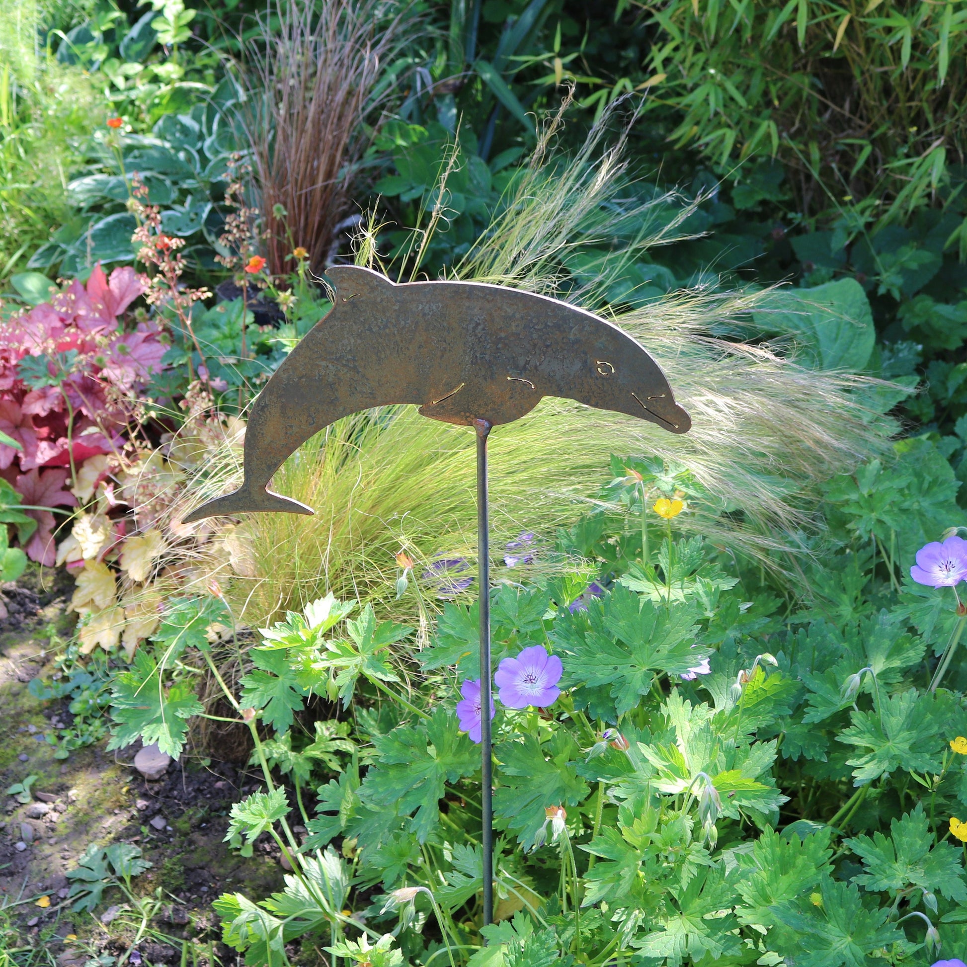 Rusty metal dolphin. Add all year round interest to your garden with our attractive rusty dolphin garden decoration. The mild steel is designed to weather naturally out in the elements, the beautiful rusty colours and textures will bring a truly organic feel to your planters, flower beds and borders. This item is hand finished so may vary slightly from the photograph.