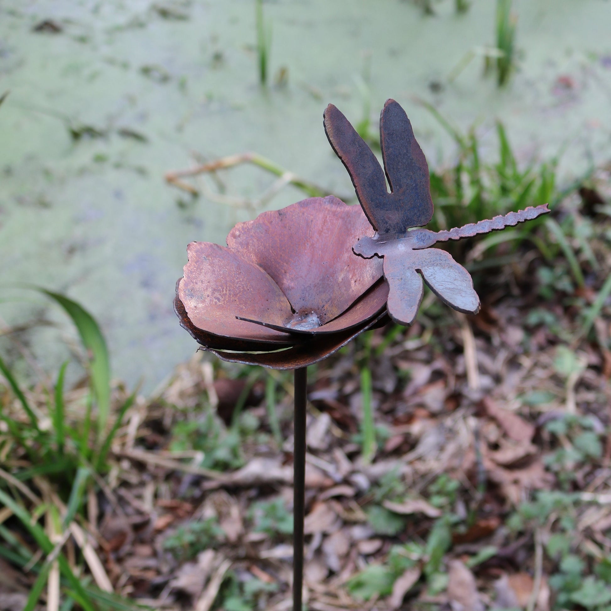 Hand made rusty metal 3D dragonfly and poppy. Add a new dimension and all year round interest to your garden with our attractive dragonfly and poppy garden decoration. The mild steel is designed to weather naturally out in the elements, the beautiful rusty colours and textures will bring a truly organic feel to your planters, flower beds and borders. Other designs available. This piece is hand made, so may differ slightly from the photograph.