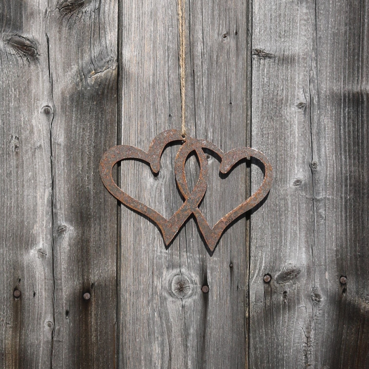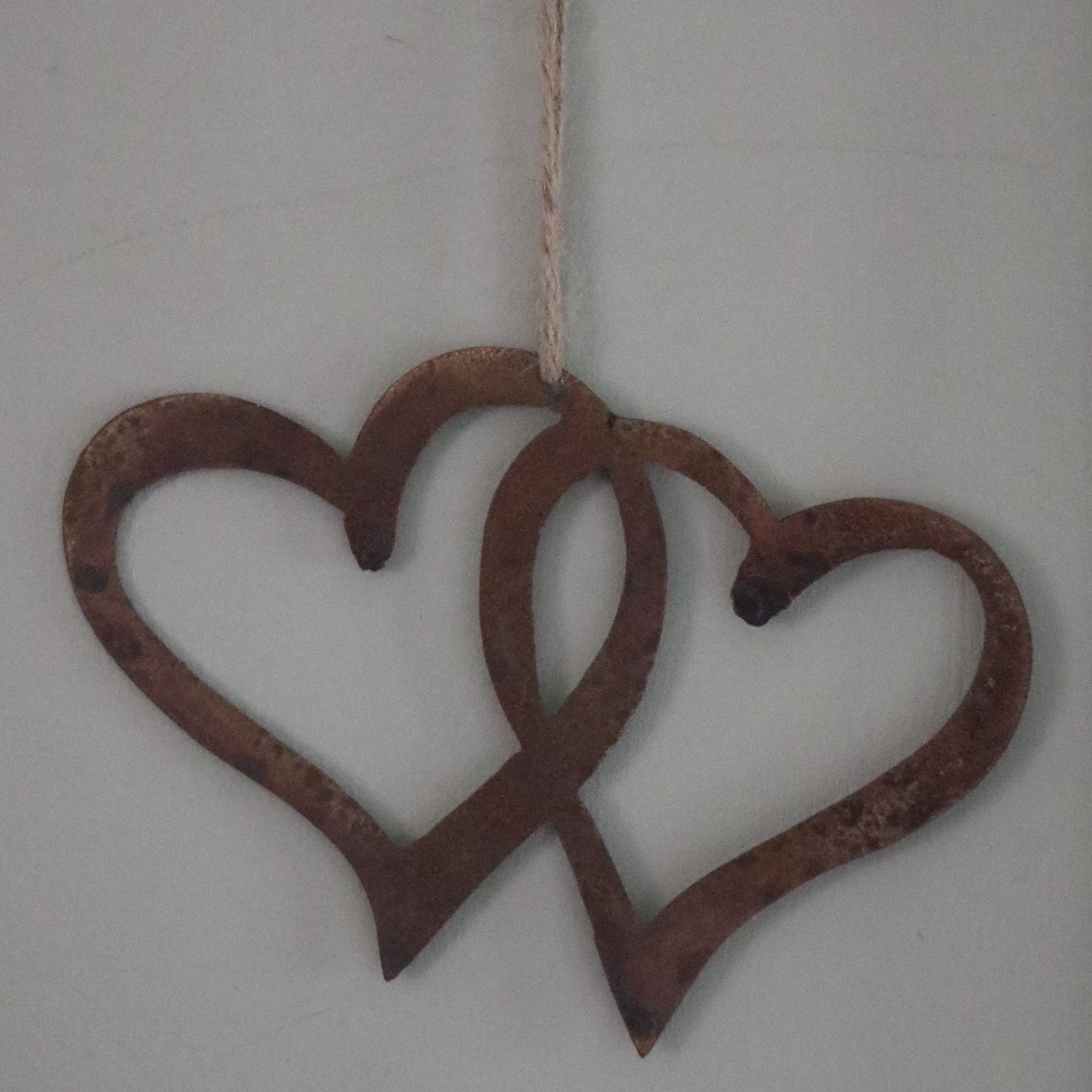 Rusty metal hanging strung entwined hearts. Add all year round interest to your garden with our attractive rusty entwined hearts garden decoration. The mild steel is designed to weather naturally out in the elements, the beautiful rusty colours and textures will bring a truly organic feel to your garden. Also a perfect rustic decoration for the home. This item is hand finished so may vary slightly from the photograph.