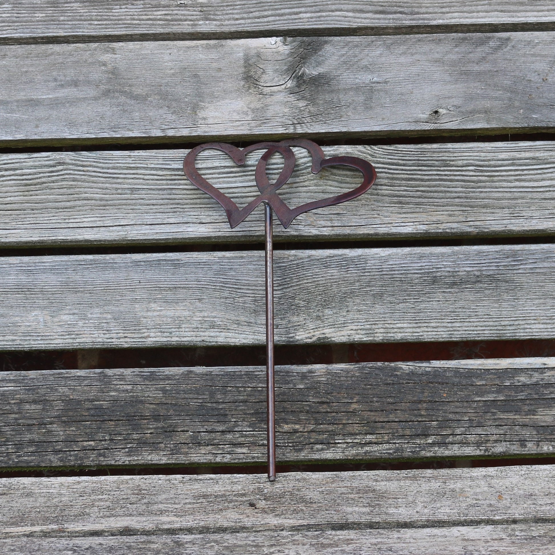 Rusty metal entwined hearts plant pot decoration. Add all year round interest to your garden with our attractive rusty entwined hearts garden decoration. The mild steel is designed to weather naturally out in the elements, the beautiful rusty colours and textures will bring a truly organic feel to your flower pots and planters. This item is hand finished so may vary slightly from the photograph.