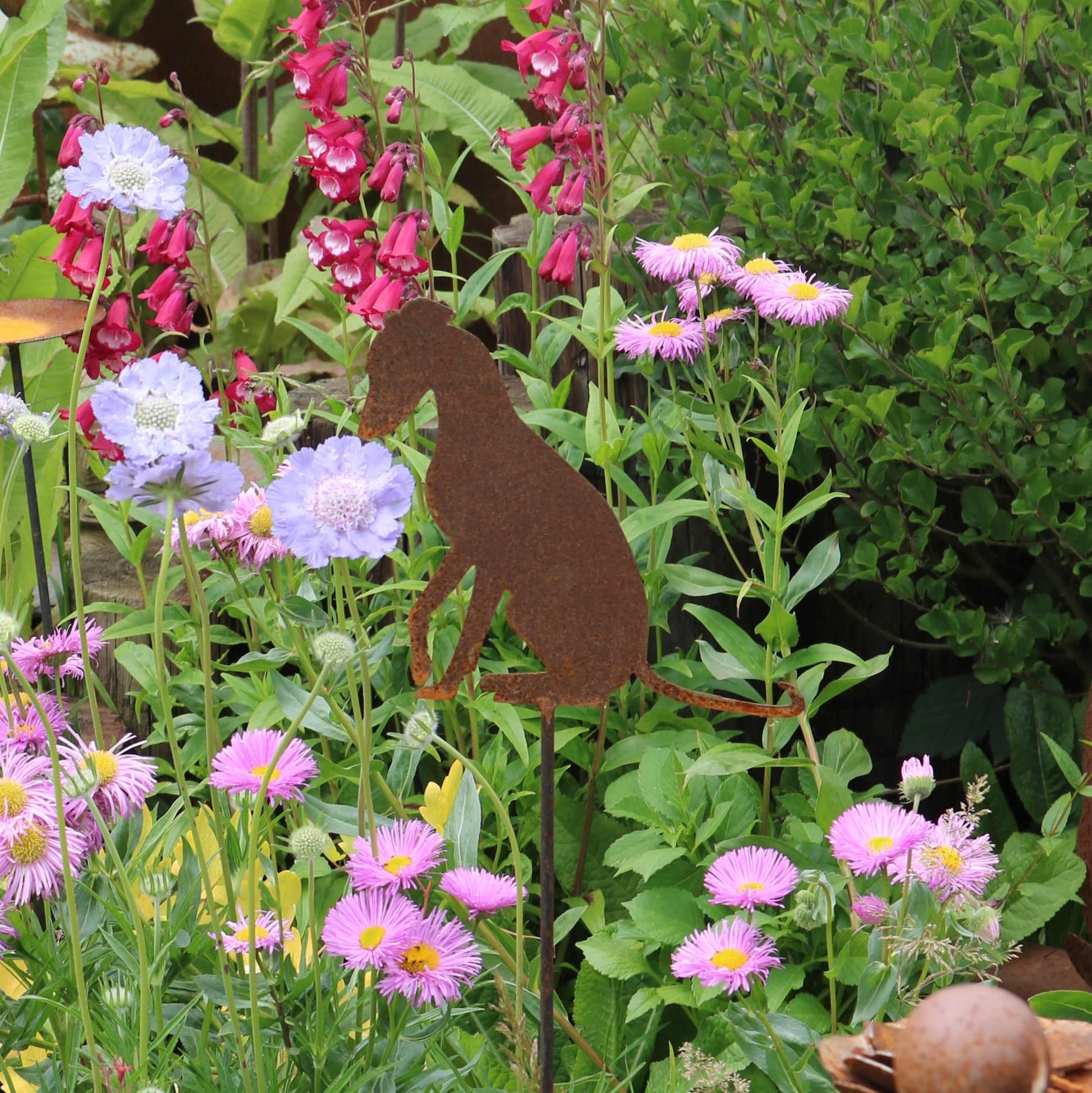 Bespoke rusty metal hanging greyhound, whippet, lurcher garden decoration. This is a design inspired by a friends beautiful dog Sidney. The mild steel is designed to weather naturally out in the elements, the beautiful rusty colours and textures will bring a truly organic feel to your garden, planters, flower beds and borders. It is also a fabulous rustic ornament for the home. This item is hand finished, so may differ slightly from the photograph.