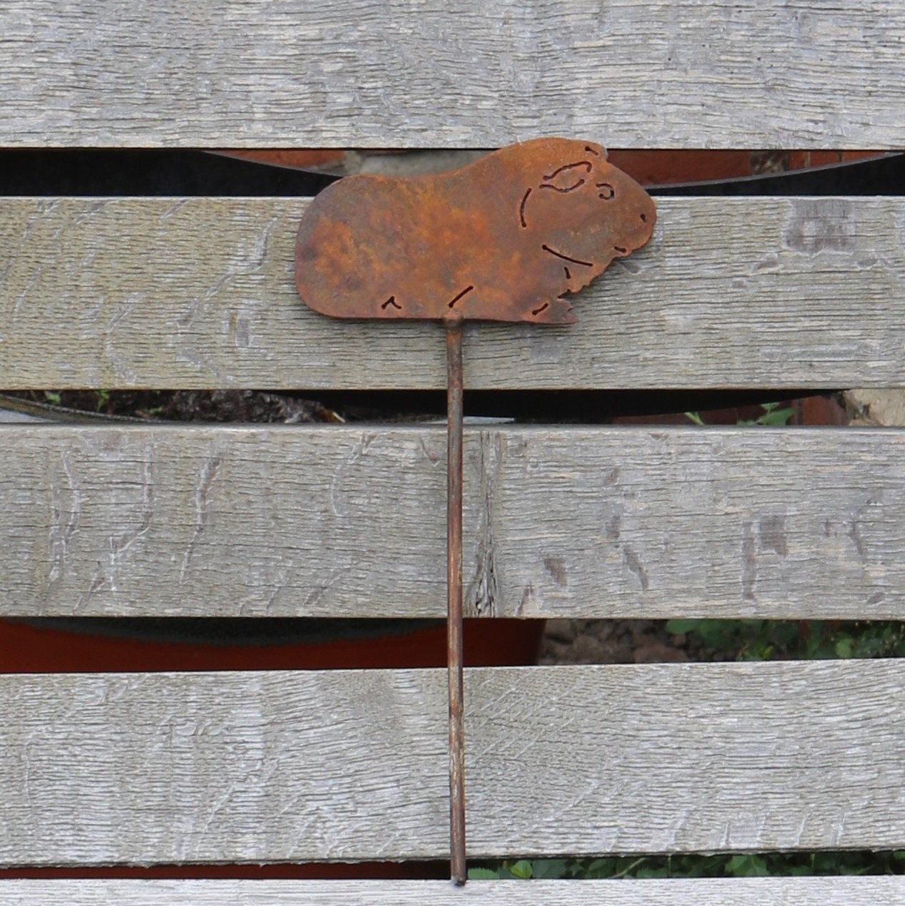 Rusty metal guinea pig plant pot decoration, garden decoration or pet memorial. The mild steel is designed to weather naturally out in the elements, the beautiful rusty colours and textures will bring a truly organic feel to your planters, flower beds and borders. It is also a fabulous rustic ornament for the home. This item is hand finished, so may differ slightly from the photograph.