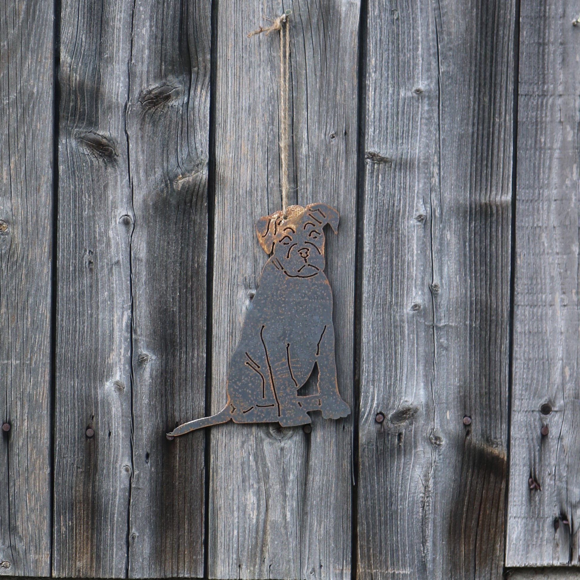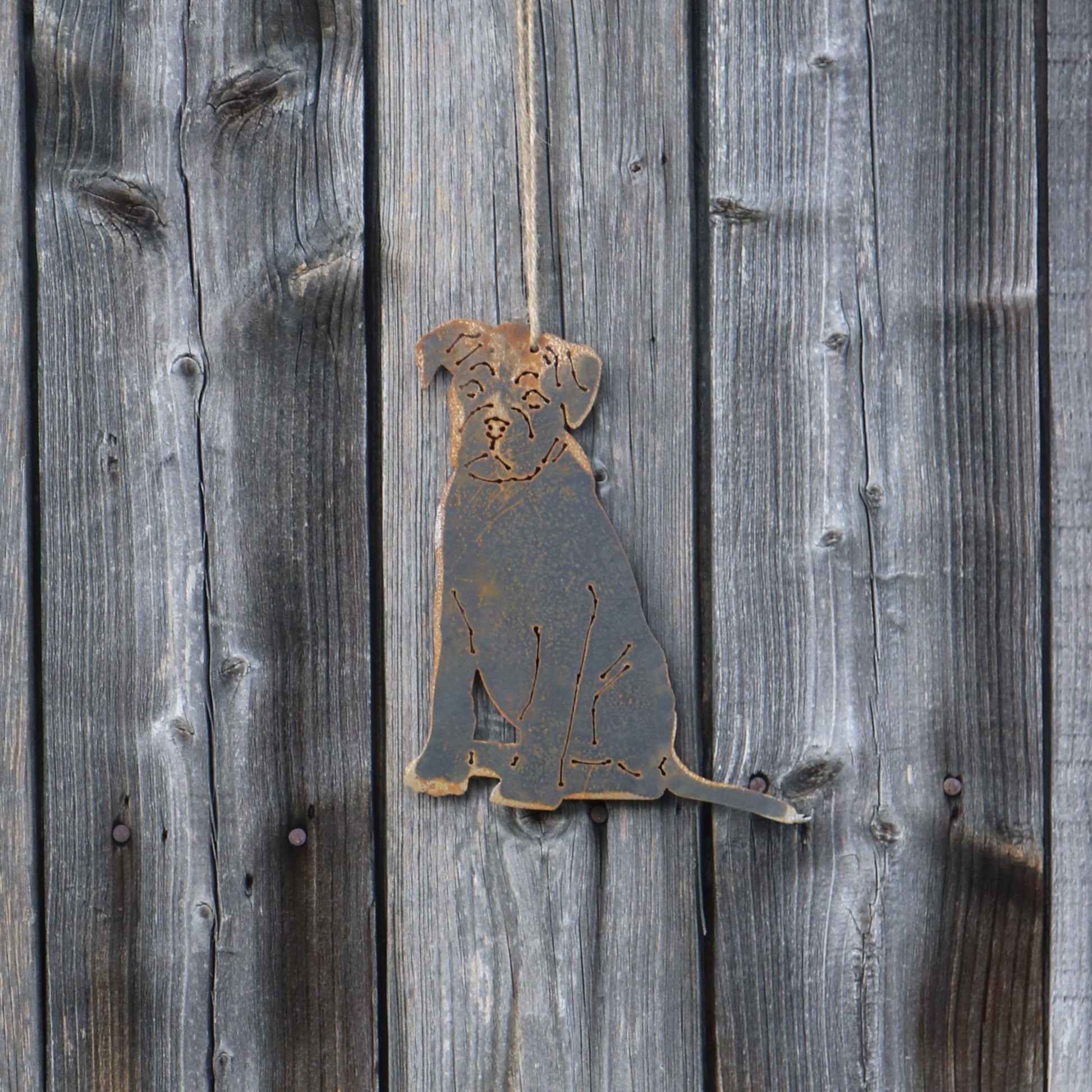 Hanging boxer dog decoration made from rusty metal. The mild steel is designed to weather naturally out in the elements, the beautiful rusty colours and textures will bring a truly organic feel to your garden, planters, flower beds and borders. This item is hand finished, so may differ slightly from the photograph.