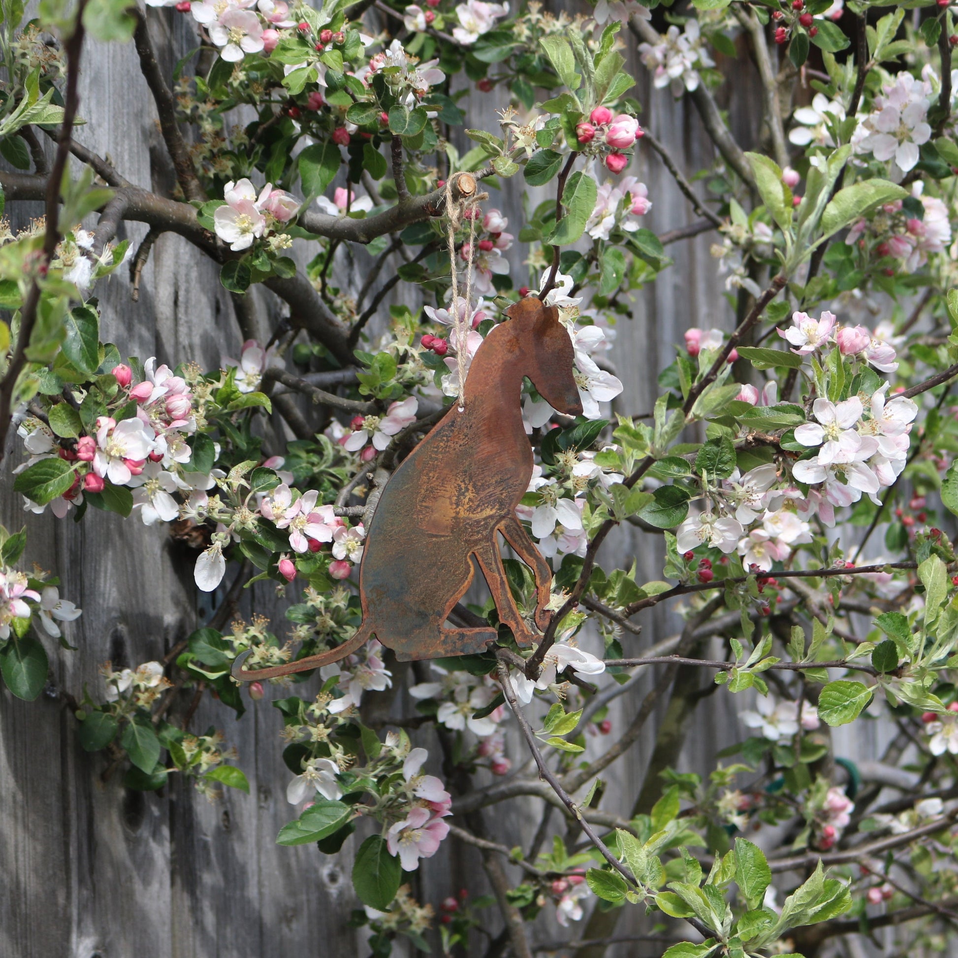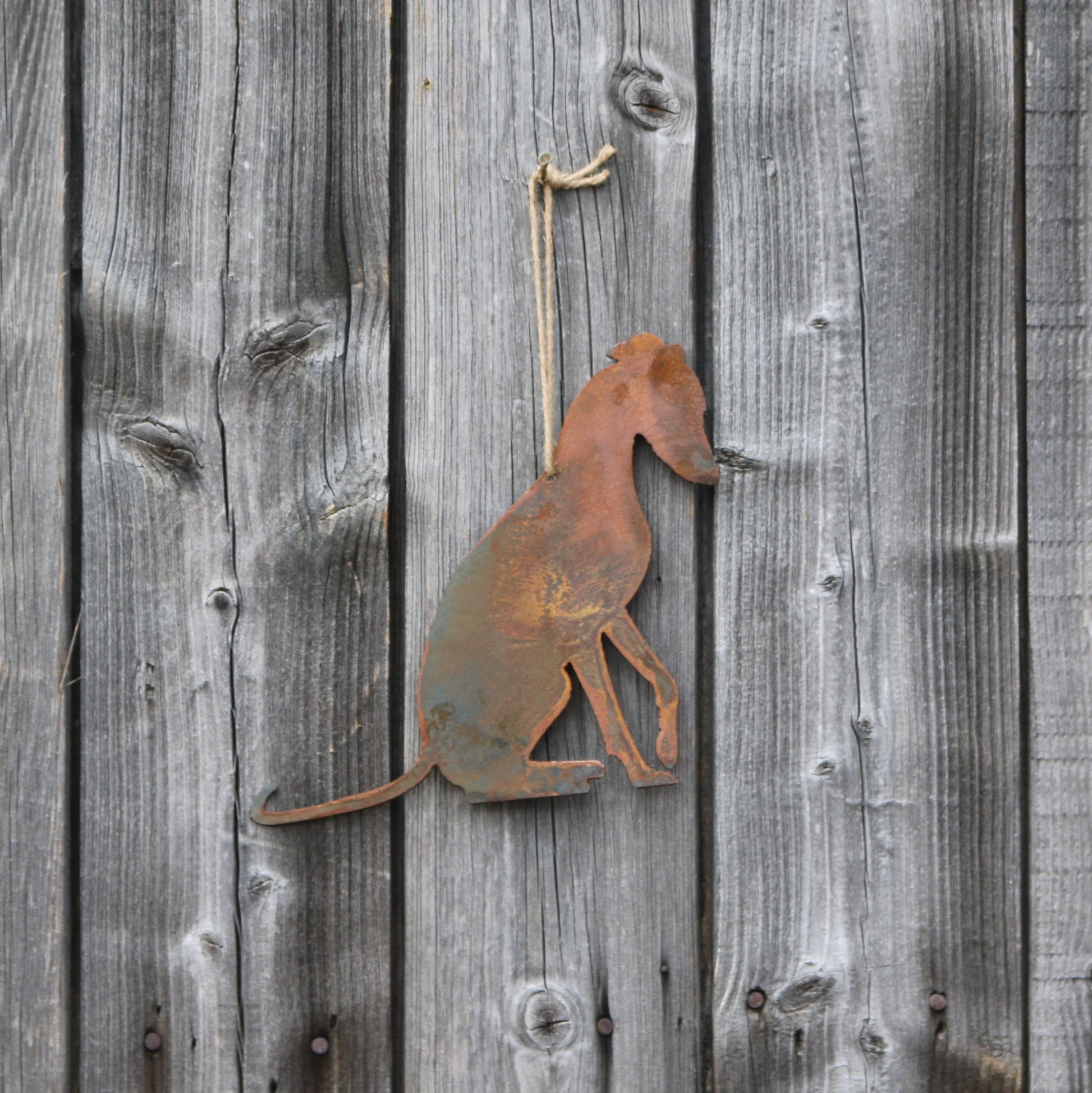 Bespoke rusty metal greyhound, whippet, lurcher garden decoration. This is a design inspired by a friends beautiful dog Sidney which was originally made by our family business for a bespoke boot holder. The mild steel is designed to weather naturally out in the elements, the beautiful rusty colours and textures will bring a truly organic feel to your garden, planters, flower beds and borders. This item is hand finished, so may differ slightly from the photograph.