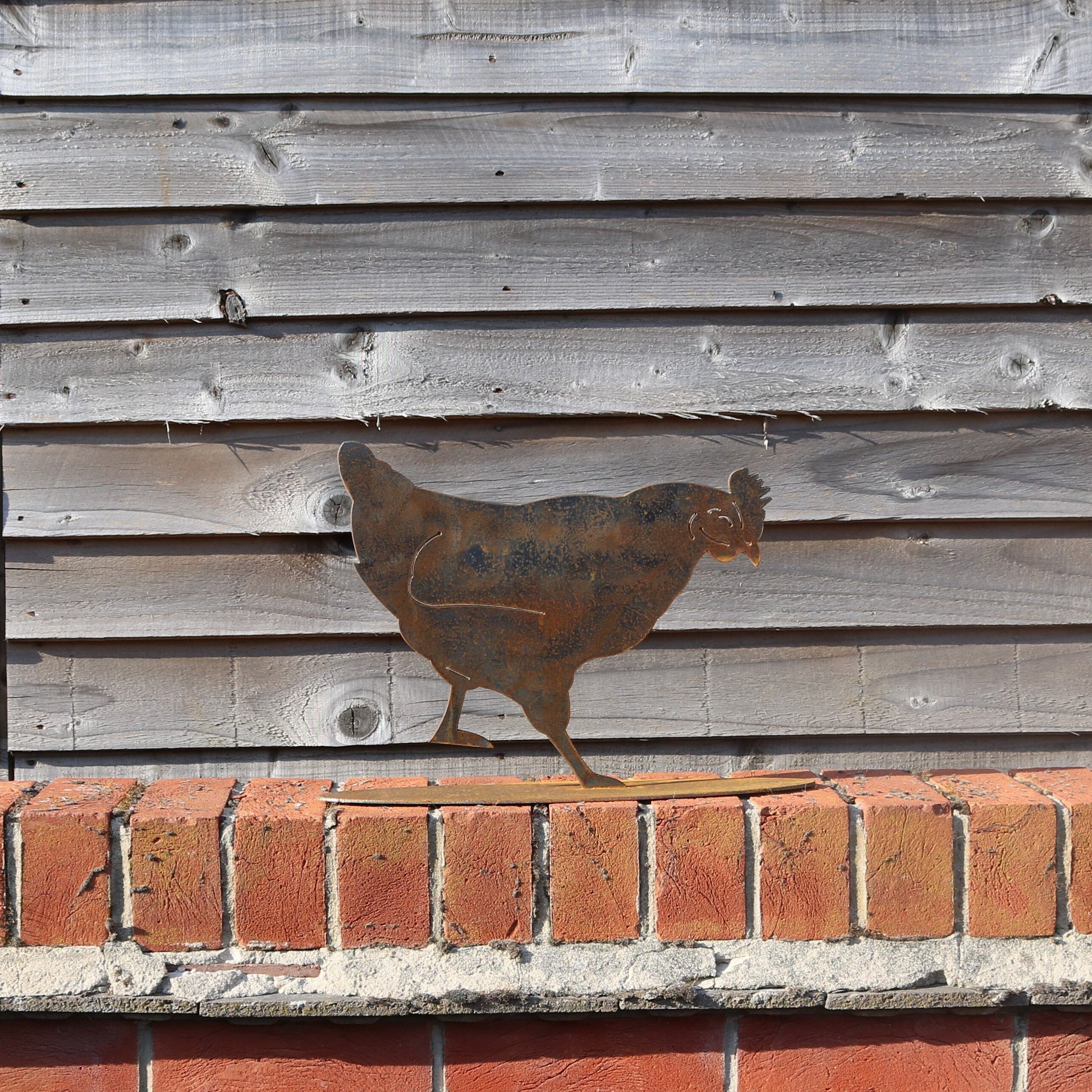 Rusty metal chicken statue home and garden decoration. The mild steel is designed to weather naturally out in the elements, the beautiful rusty colours and textures will bring a truly organic feel to your planters, flower beds and borders. It is also a fabulous rustic ornament for the home. This item is hand finished, so may differ slightly from the photograph.
