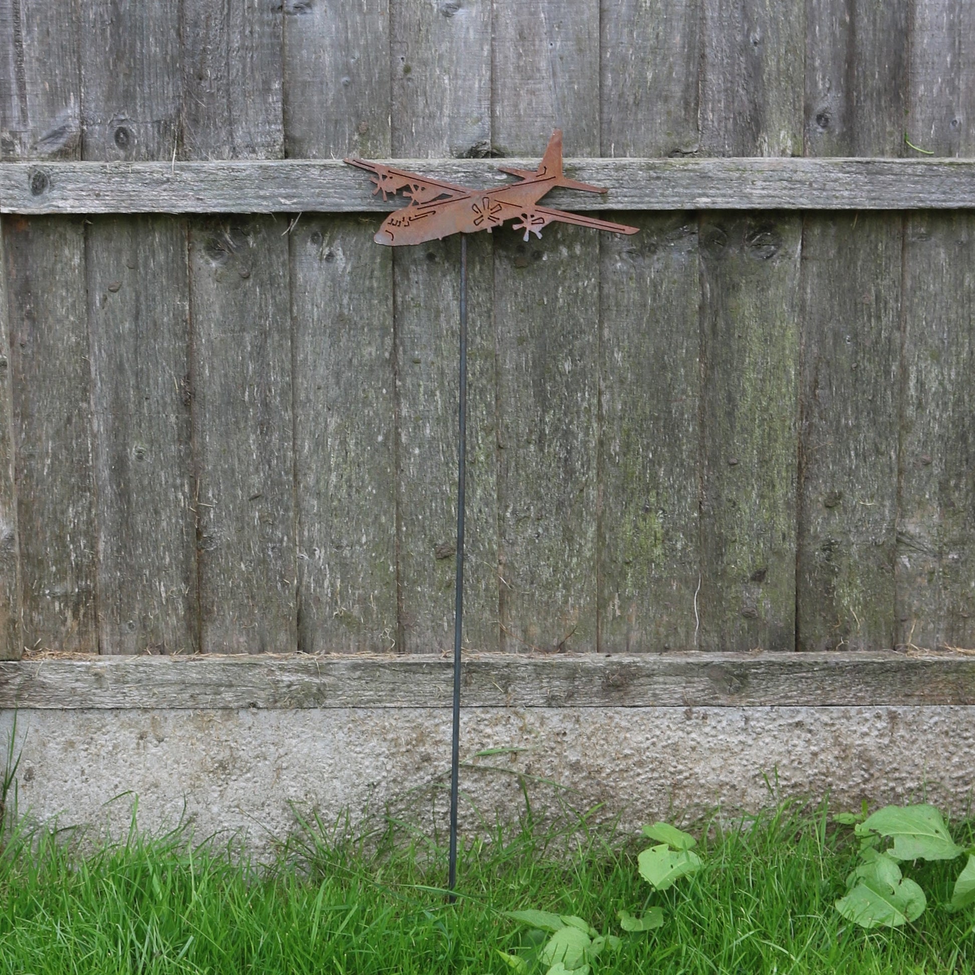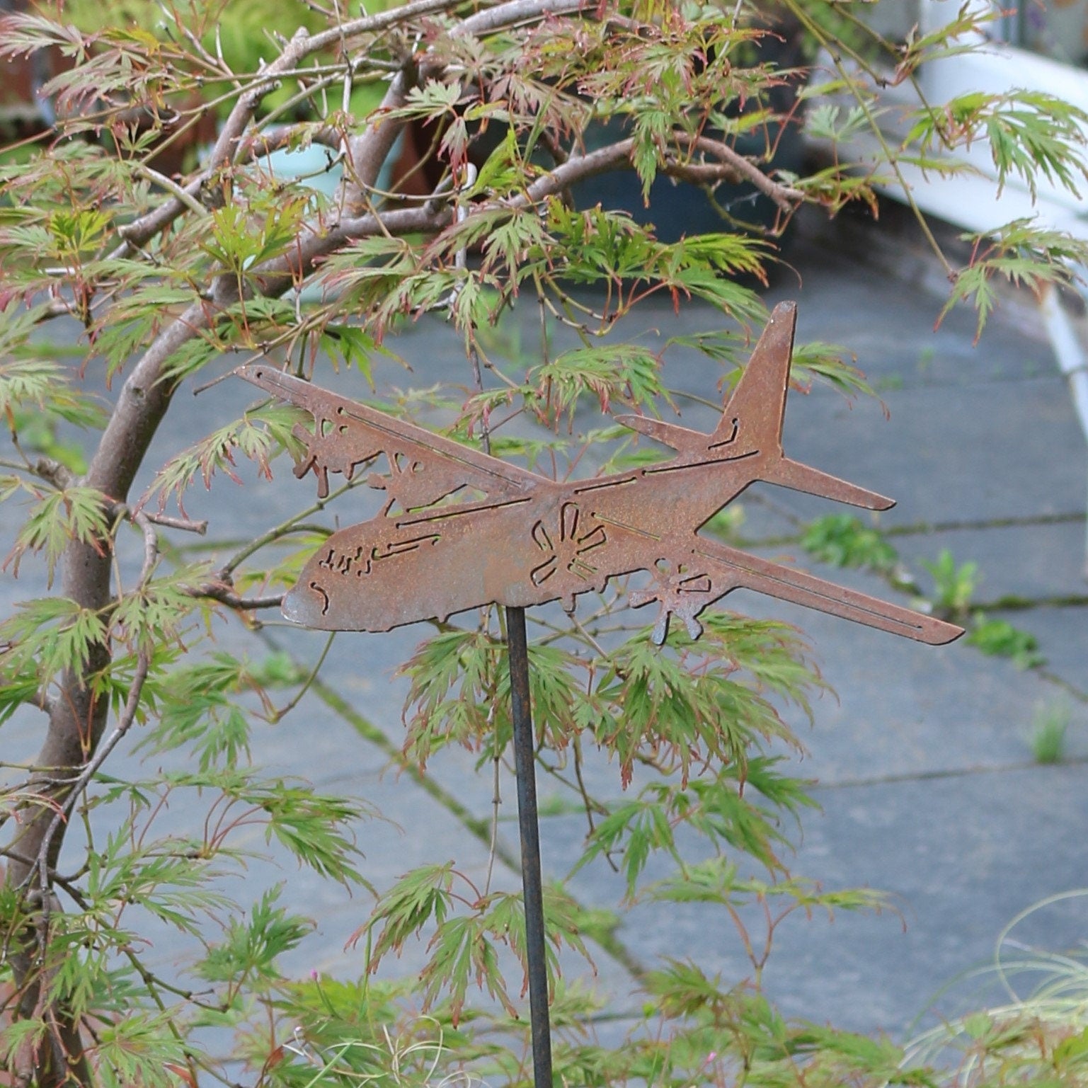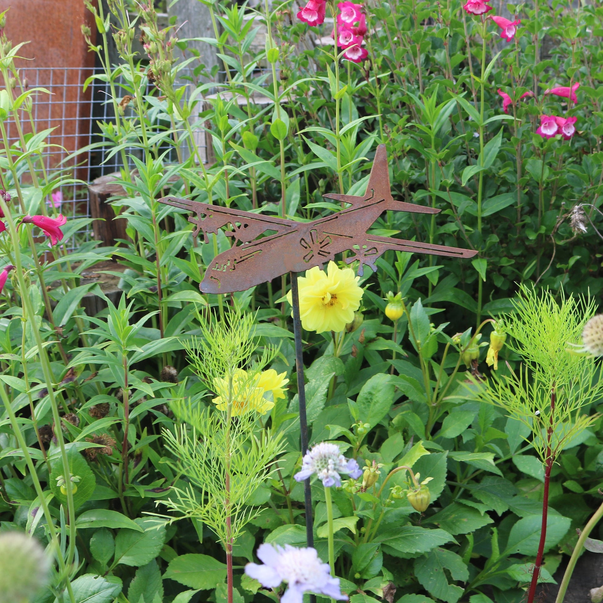 Our rusty metal C-130 Hercules plane. The mild steel is designed to weather naturally out in the elements, the beautiful rusty colours and textures will bring a truly organic feel to your planters, flower beds and borders. It is also a fabulous rustic ornament for the home.