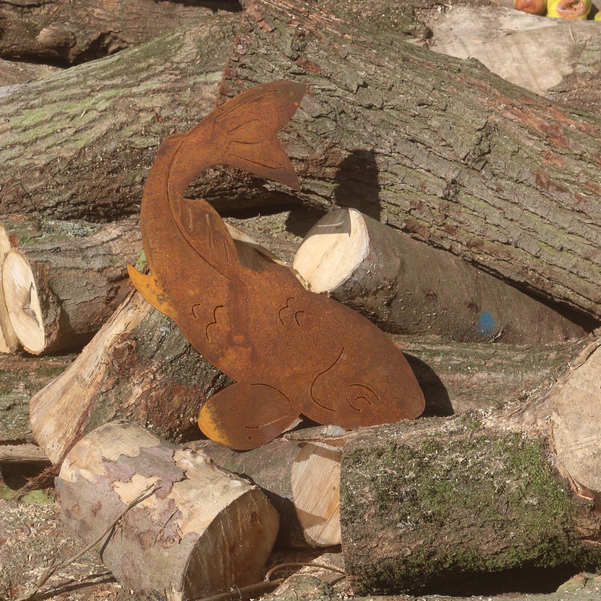 Our original custom design wall mounted koi carp wall art. Designed and manufactured by us in the UK. Cut from mild steel in a rusty finish. It has 2 tabs welded onto the back for easy invisible fixing. The mild steel is designed to weather naturally out in the elements, the beautiful rusty colours and textures will bring a truly organic feel to your garden, planters, flower beds and borders. This item is hand finished, so may differ slightly from the photograph.