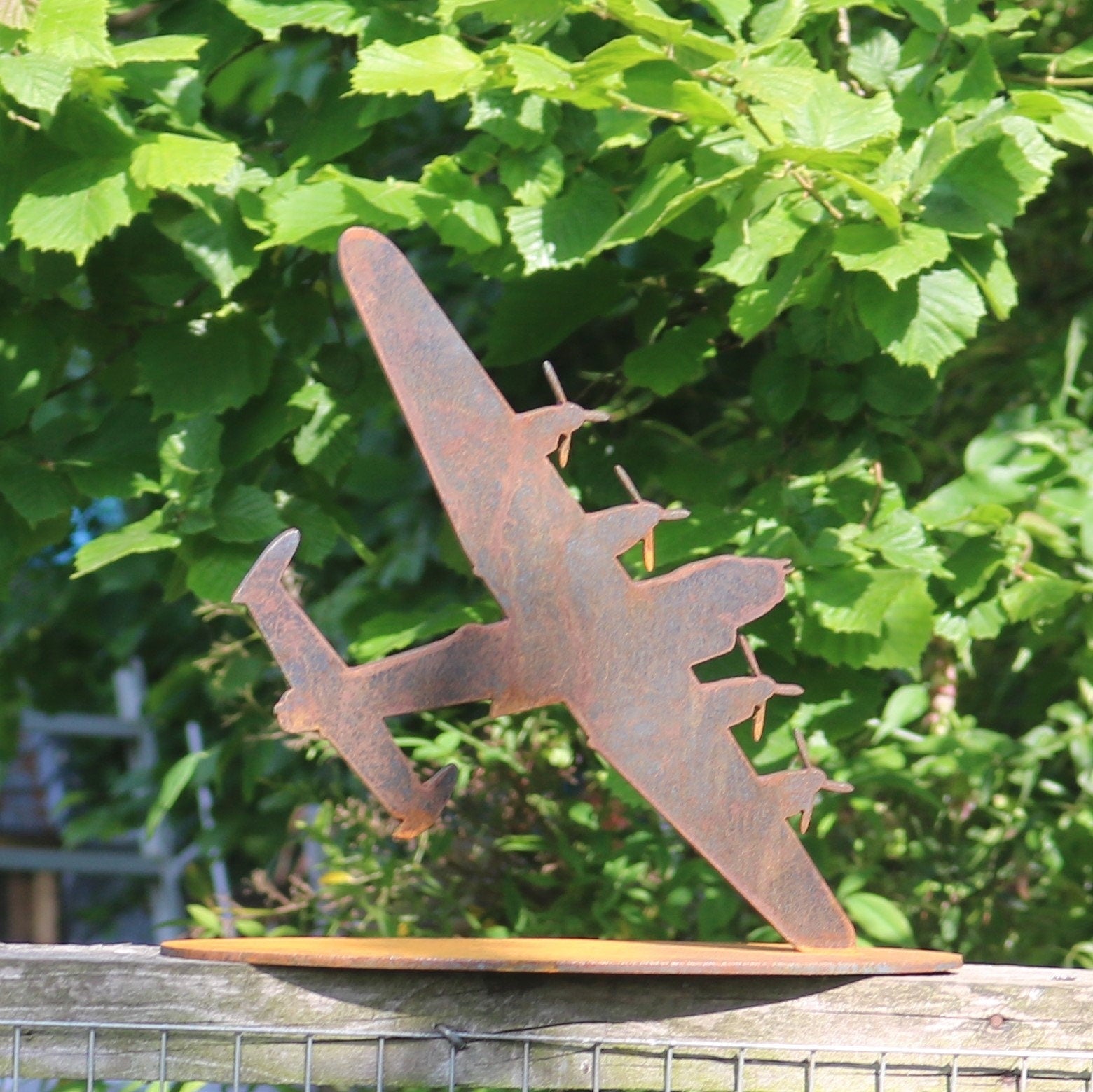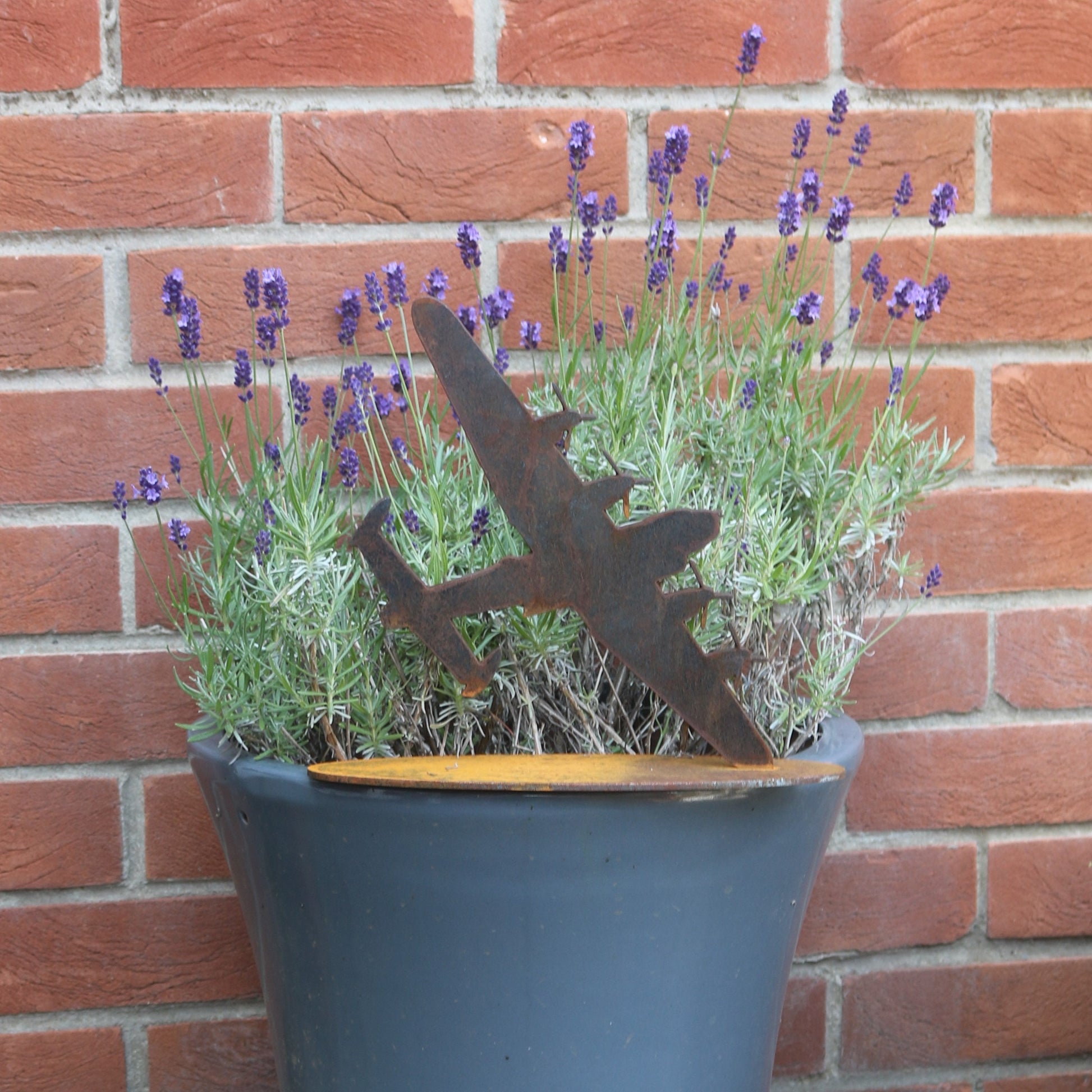 Add a new dimension and interest to your garden with our attractive rusty Lancaster bomber garden decoration. The mild steel is designed to weather naturally out in the elements. The beautiful rusty colours and textures will bring a truly organic feel to your planters, flower beds and borders, requiring no maintenance and looking better with age. Also an unusual ornament for the home. This item is hand finished, so may differ slightly from the photograph.