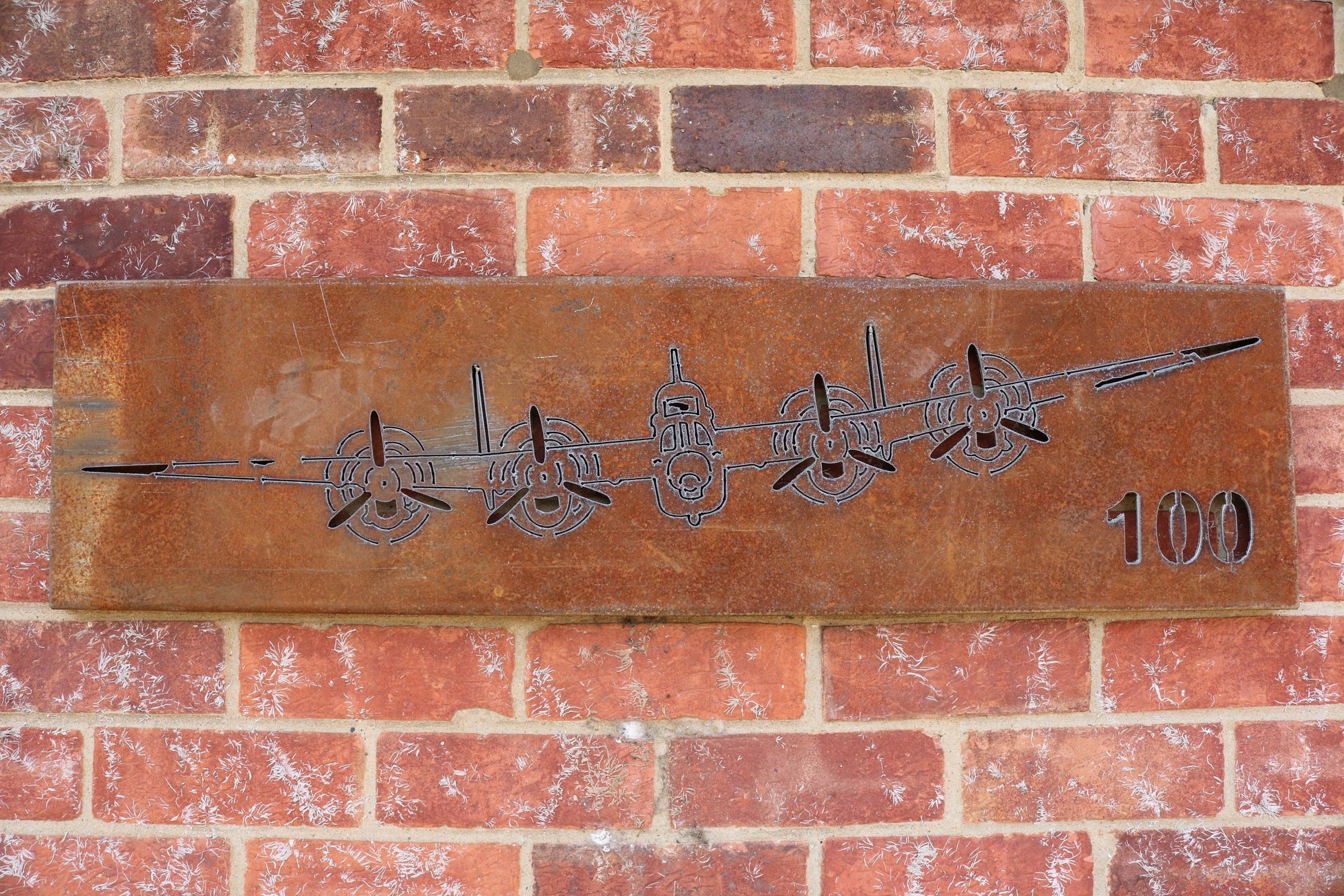 A stunning gift for a plane lover, this Lancaster bomber wall panel looks impressive indoors or outdoors. It is made from rusty mild steel and has folded edges so sits in front of the wall and has 2 fixing brackets at the back. The personalised example shown was made to commemorate 100 years of the RAF but can be personalised with up to 7 letters. The mild steel is designed to weather naturally out in the elements, the beautiful rusty colours and textures will bring a truly organic feel to your garden. It is also a fabulous rustic ornament for the home. This item is hand finished, so may differ slightly from the photograph.
