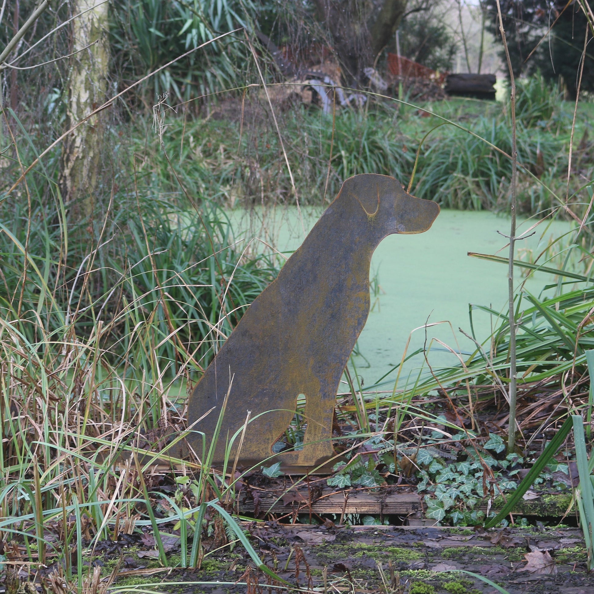 Life size rusty metal Labrador, home décor, garden decoration. This is an original design of a friends beautiful dog Ash. The mild steel is designed to weather naturally out in the elements, the beautiful rusty colours and textures will bring a truly organic feel to your garden, planters, flower beds and borders. This item is hand finished, so may differ slightly from the photograph.