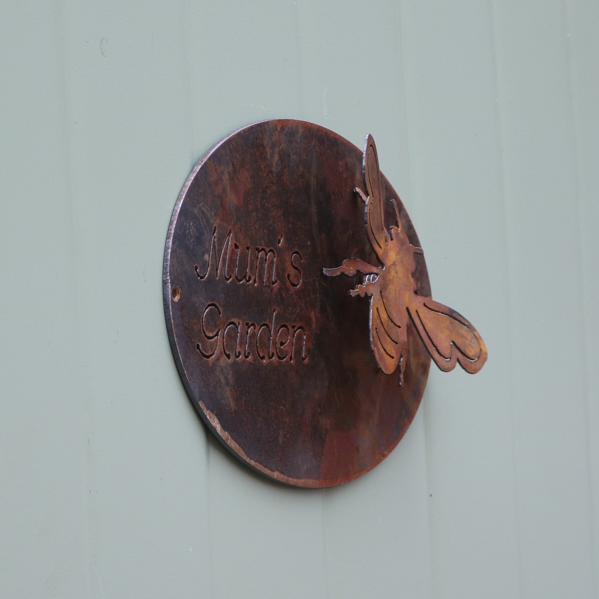 Our original custom design wall mounted sign with 3d bee. Designed and manufactured by us in the UK. Cut from mild steel in a rusty finish. With 2 pre-drilled holes. Can be personalised with up to 10 letters. The mild steel is designed to weather naturally out in the elements, the beautiful rusty colours and textures will bring a truly organic feel to your garden, planters, flower beds and borders. This item is hand finished, so may differ slightly from the photograph.