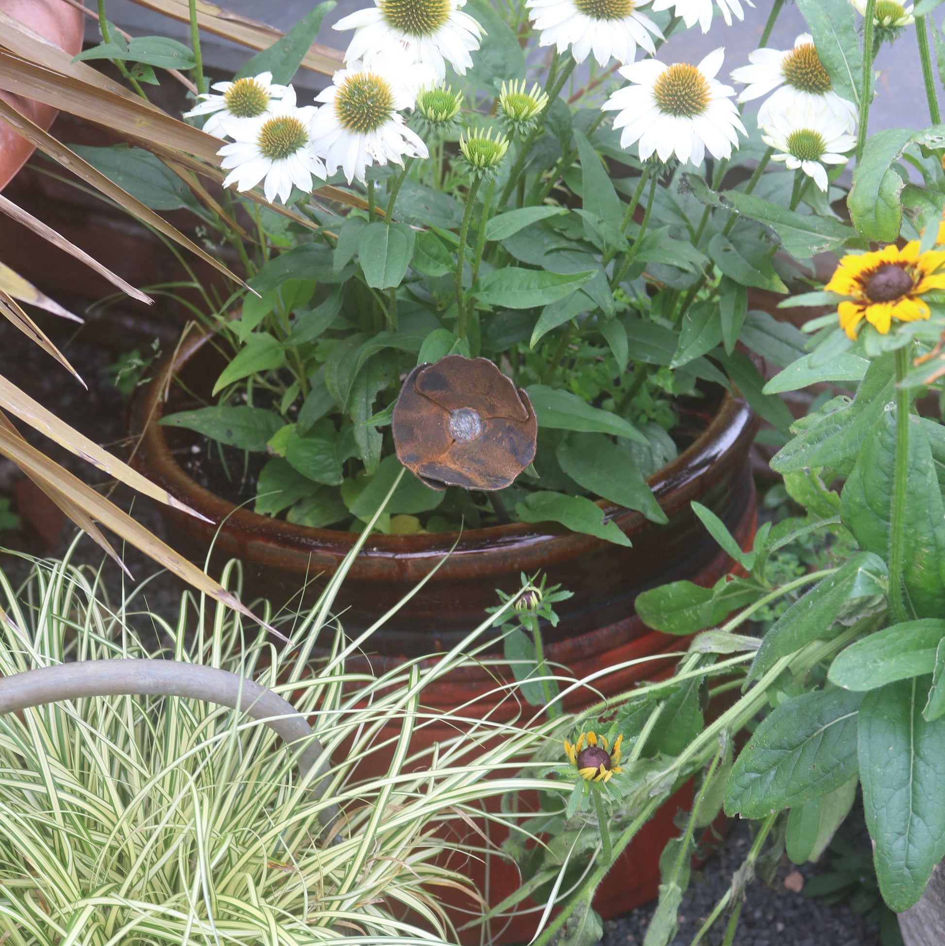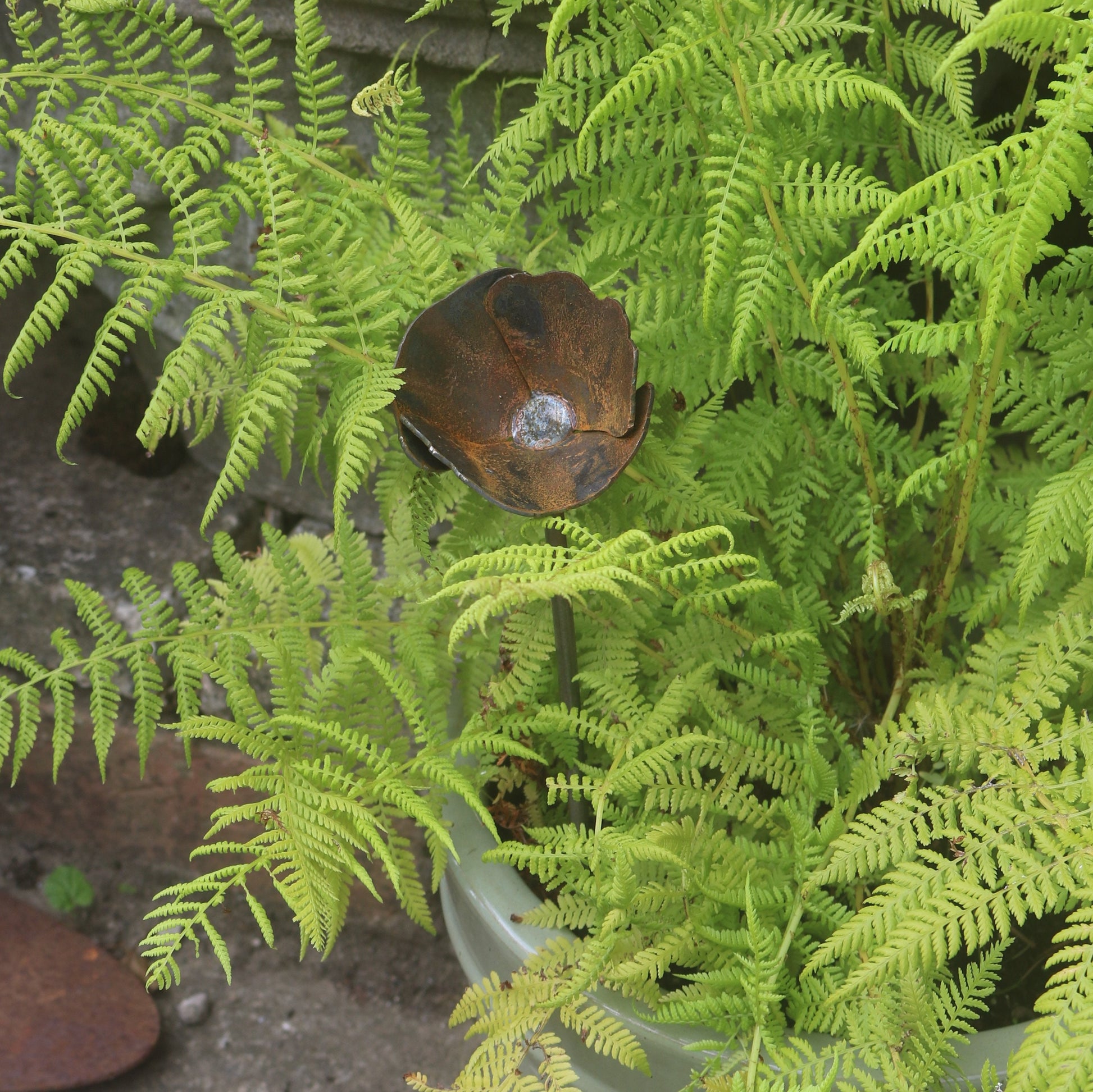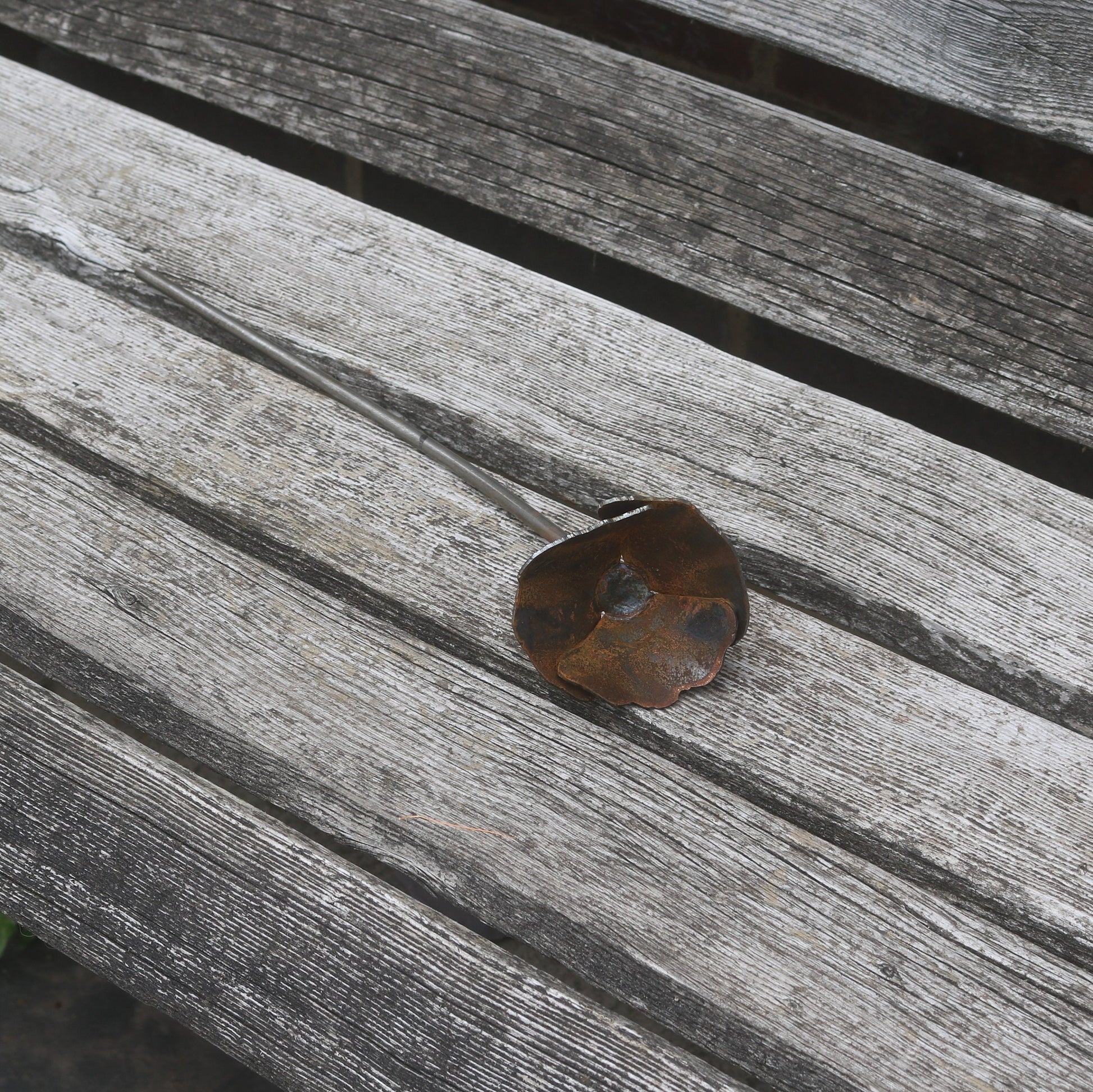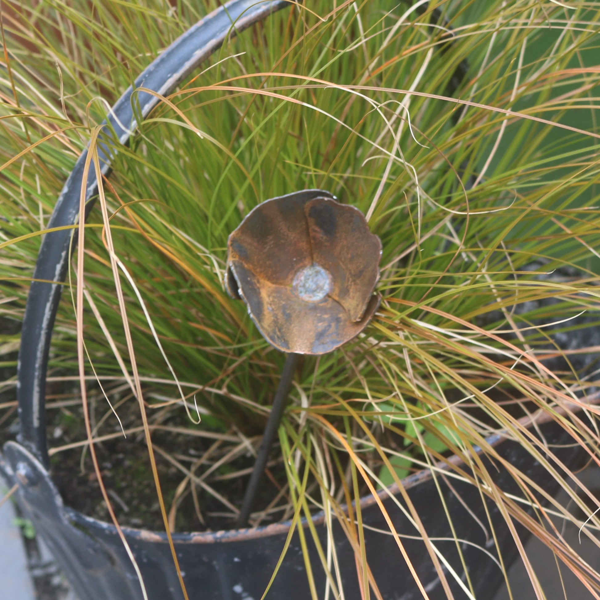 Handmade rusty metal poppy. The mild steel is designed to weather naturally out in the elements, the beautiful rusty colours and textures will bring a truly organic feel to your planters, flower beds and borders. This item is hand finished, so may differ slightly from the photograph.