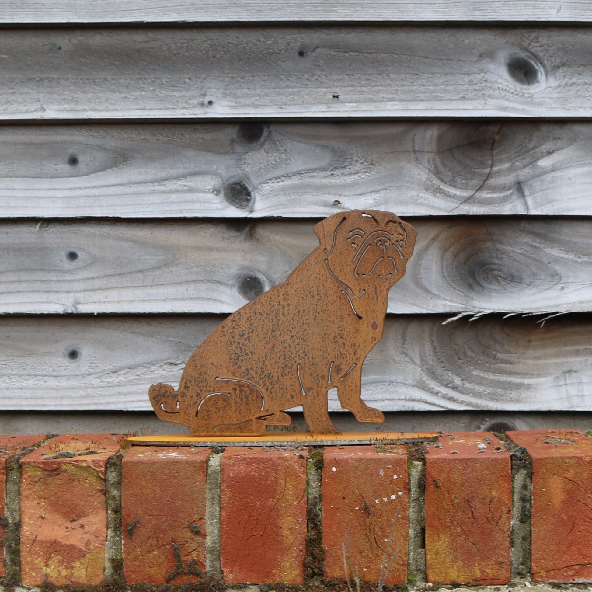 Bespoke rusty metal pug statue. This is a design of a friends beautiful dog Betty. The mild steel is designed to weather naturally out in the elements, the beautiful rusty colours and textures will bring a truly organic feel to your garden, planters, flower beds and borders. It is also a fabulous rustic ornament for the home. This item is hand finished, so may differ slightly from the photograph.