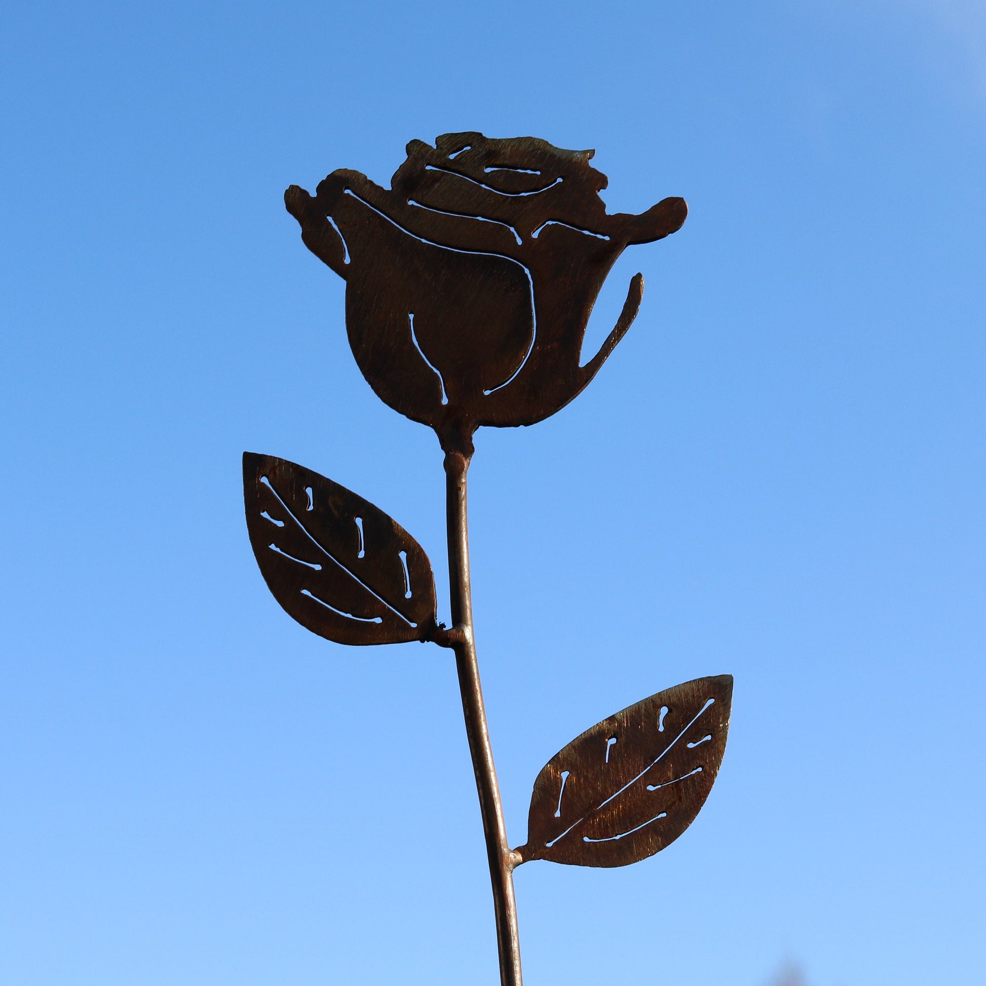 2D rusty metal rose. Add all year round interest to your garden with our attractive rusty metal rose flower garden decoration. The mild steel is designed to weather naturally out in the elements, the beautiful rusty colours and textures will bring a truly organic feel to your planters, flower beds and borders. This item is hand finished so may vary slightly from the photograph.