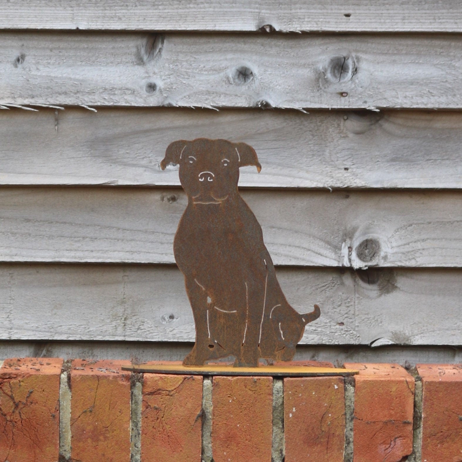 Staffie, Staffordshire terrier statue, home/garden décor made from rusty metal. This is an original design of Velvet, a sweet soul who I used to take for a walk. The mild steel is designed to weather naturally out in the elements, the beautiful rusty colours and textures will bring a truly organic feel to your garden, planters, flower beds and borders. This item is hand finished, so may differ slightly from the photograph.