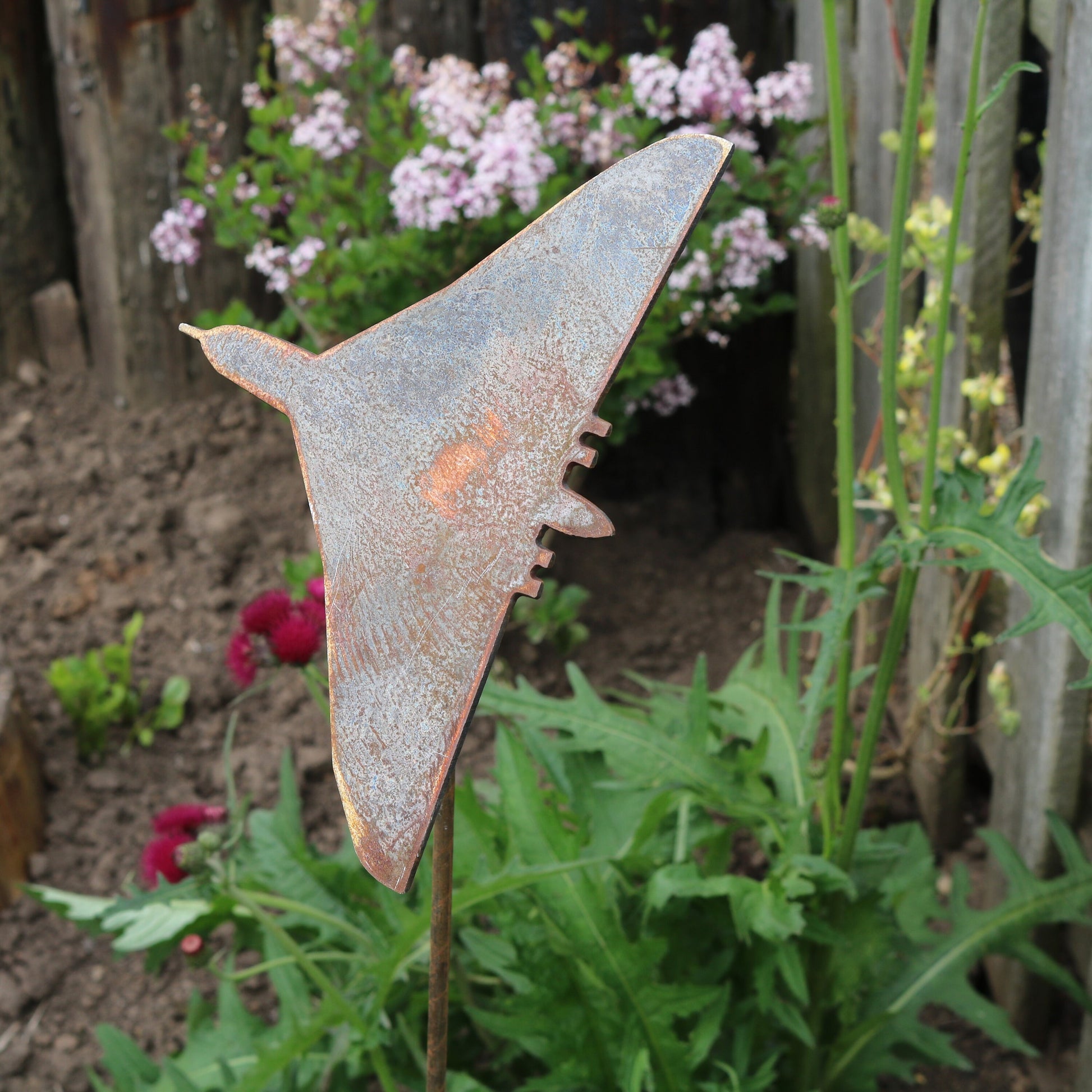 Add a new dimension and interest to your garden with our attractive rusty Vulcan bomber garden decoration. The mild steel is designed to weather naturally out in the elements, the beautiful rusty colours and textures will bring a truly organic feel to your planters, flower beds and borders. This item is hand finished, so may differ slightly from the photograph.