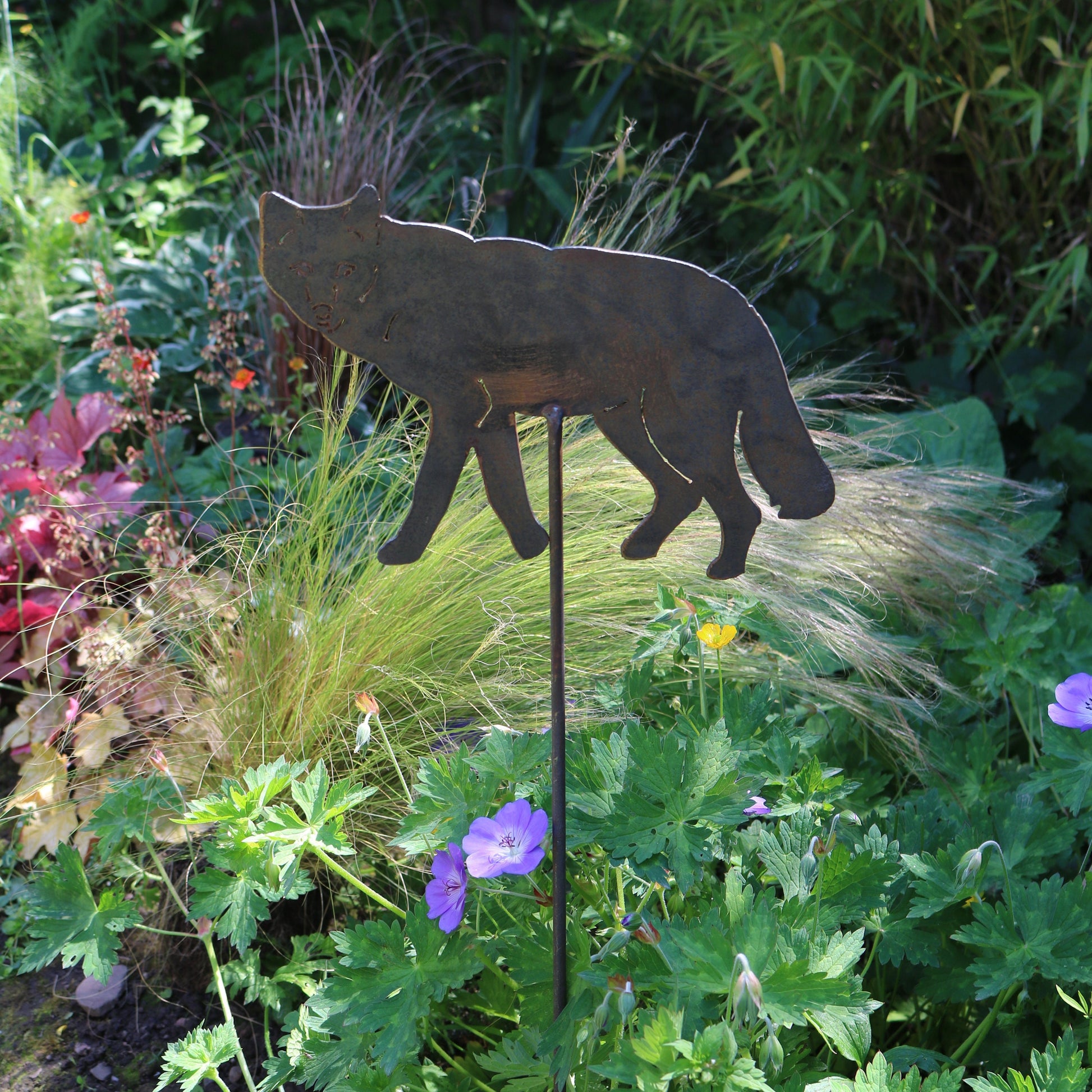 Rusty metal wolf. Add all year round interest to your garden with our attractive rusty wolf garden decoration. The mild steel is designed to weather naturally out in the elements, the beautiful rusty colours and textures will bring a truly organic feel to your planters, flower beds and borders. This item is hand finished so may vary slightly from the photograph.