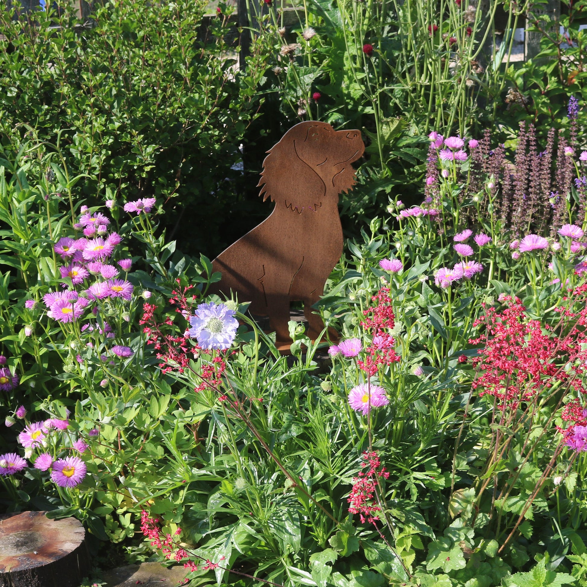Life size bespoke working cocker spaniel garden statue made from rusty metal. This is an original design of Isla, a sweet girl who comes to play at our house. The mild steel is designed to weather naturally out in the elements, the beautiful rusty colours and textures will bring a truly organic feel to your garden, planters, flower beds and borders. This item is hand finished, so may differ slightly from the photograph.